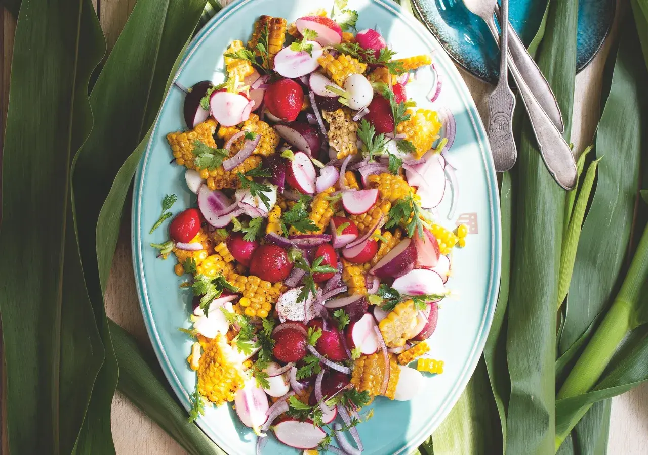 Výborný kukuřičný salát s ředkvičkami podávejte k masu (třeba steaku), ale i grilovanému sýru nebo prostě jen tak. Chybějící bílkoviny můžete dodat rozdrobenou fetou. Rázem získáte sytou večeři plnou zeleniny.