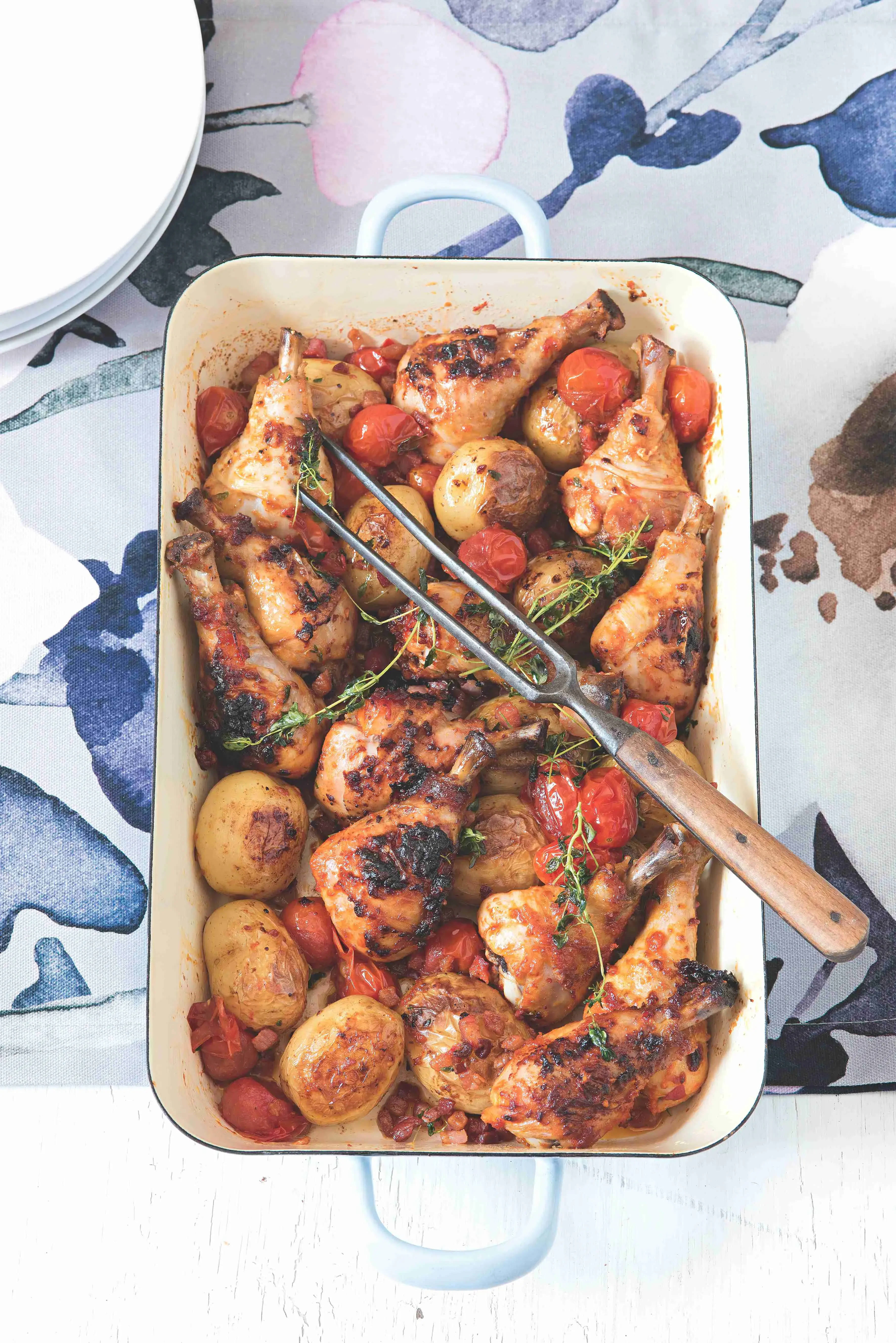 Klasický italský recept přetvořený do pečeného kuřete a brambůrek. Pokud by vám chybělo pecorino, přidejte jej při podávání.