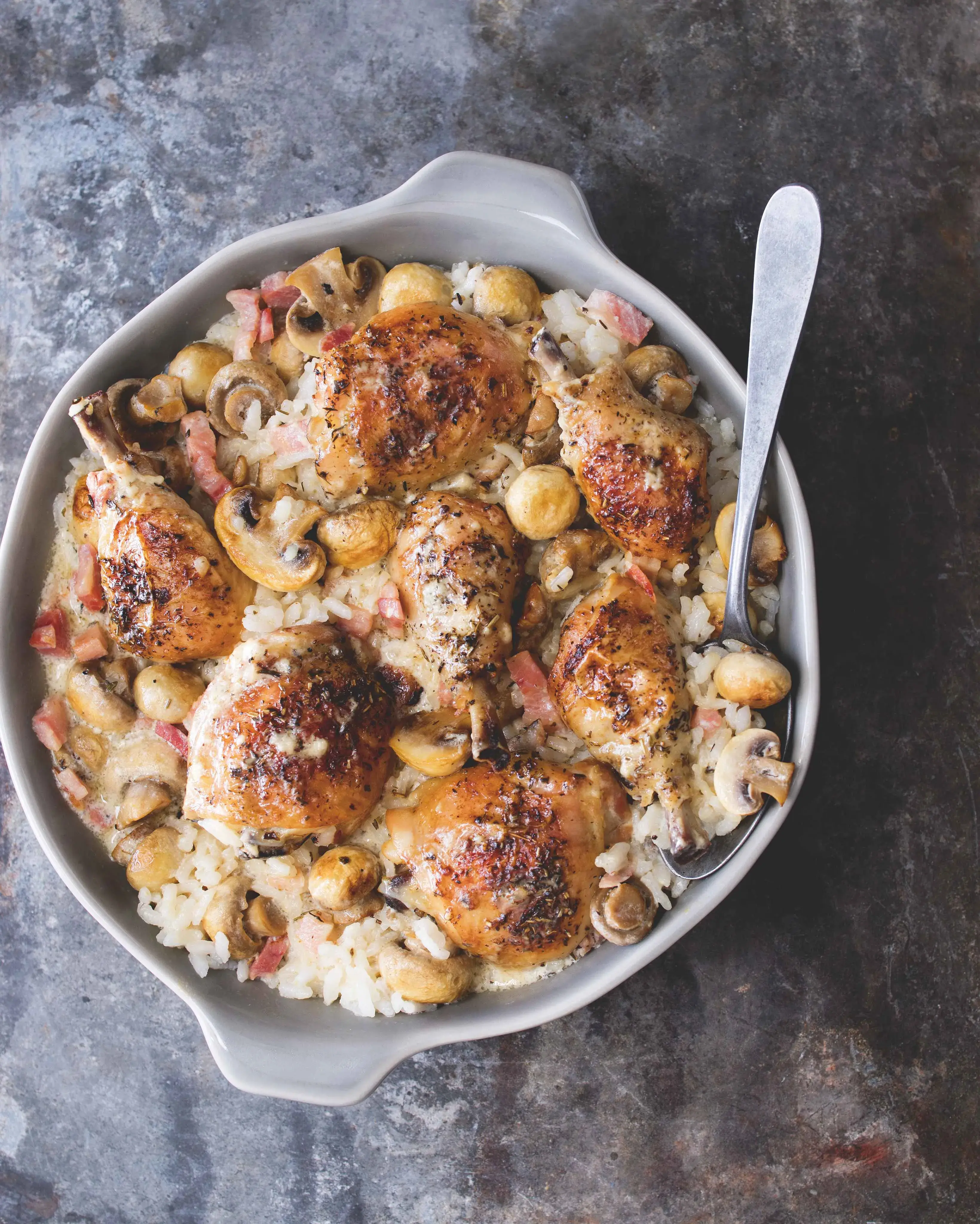 Pečené kuře na žampionech se smetanou a vínem je luxusní večeře z jednoho pekáče na světě. Do upečené směsi těsně před dokončením přidejte uvařenou rýži a pak už jen stačí položit pekáč do prostřed stolu, ať si každý nabere podle svého. Kuřecí stehna na žampionech s rýží je jídlo téměř bez práce a navíc chutná i dětem.