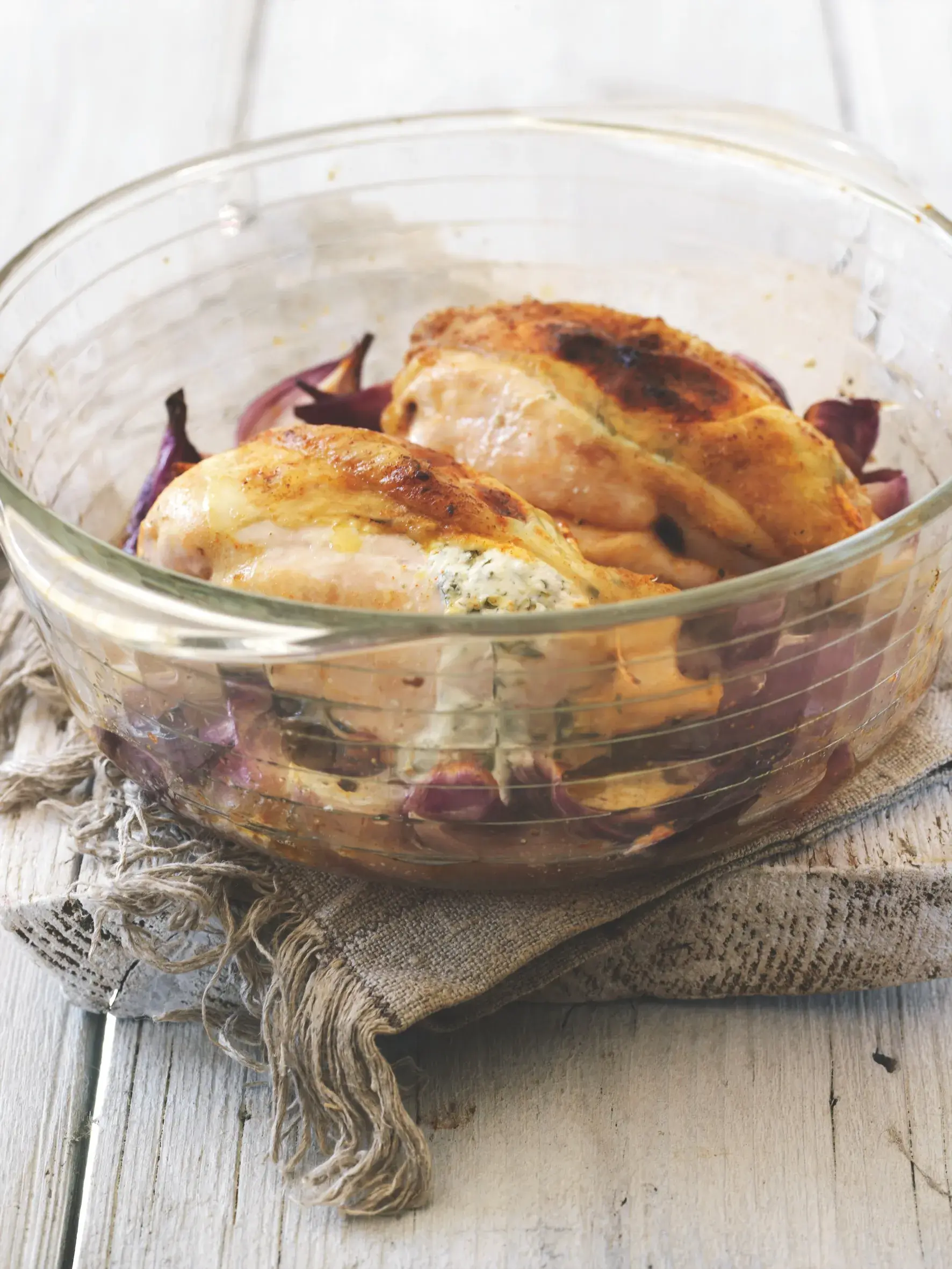 Kozí sýr s pečenými cibulkami dodá chuťově nevýraznému kuřeti šmrnc. Pokud se vám nepodaří sehnat prsíčka, sáhněte po kuřecích stehnech s kůží.