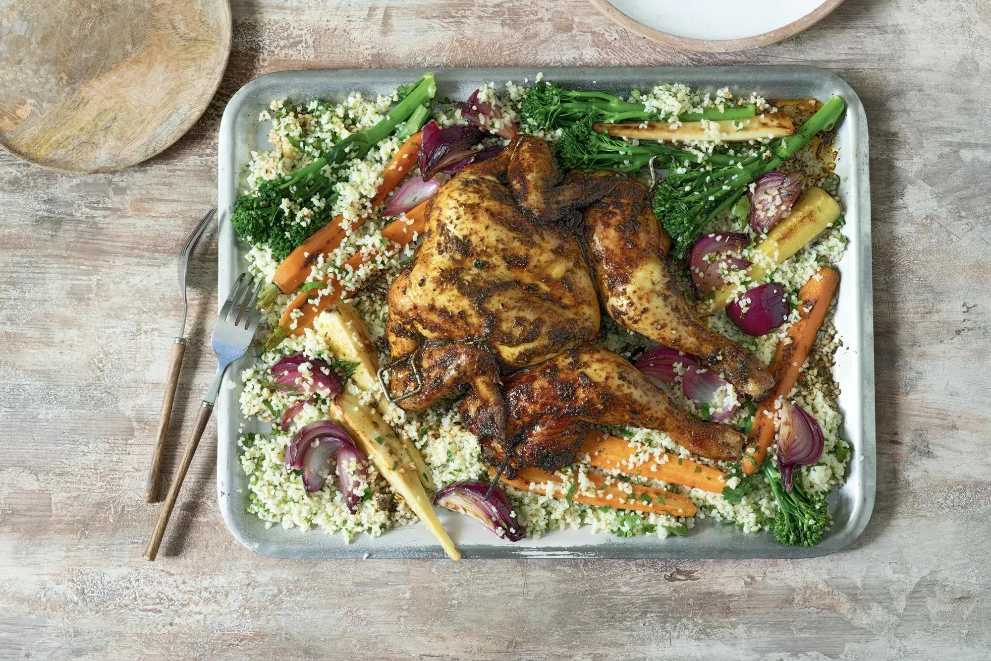 Naprosto luxusní oběd z jednoho pekáčku. Jemné kuřecí maso získá díky koření výraznou chuť a zelenina s bulgurem ho báječně doplní. Trochu jiný recept na pečené kuře, které se určitě stane stejným favoritem, jako to klasické s vařenými brambory.