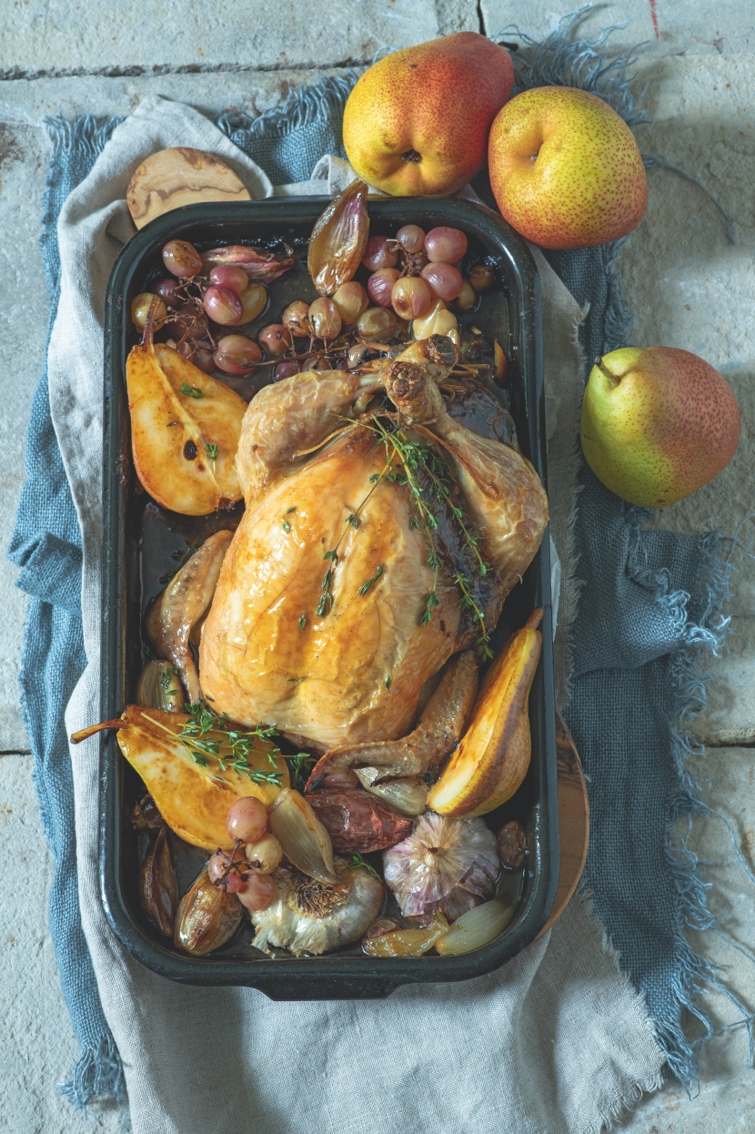 Díky hruškám, hroznovému vínu i švestkám má pokrm nasládlou chuť, což vyvažuje zemitější chuť jater. Díky kroupám je i v nádivce do čeho kousnout, ale pokud nemáte tyto obiloviny v lásce, můžete použít vařenou rýži nebo ještě jemnější kostičky bílého pečiva. Tohle pečené kuře budete k nedělnímu obědu během podzimních měsíců pect zas a znova.