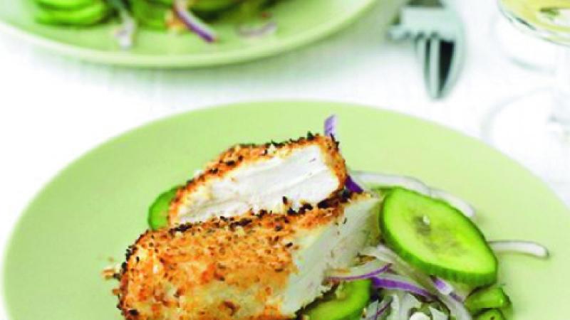 Zajímavá kombinace, kterou si zamilujete. Kokos maso krásně zjemní, spojení se šťavnatým salátem mu dodá na originalitě.