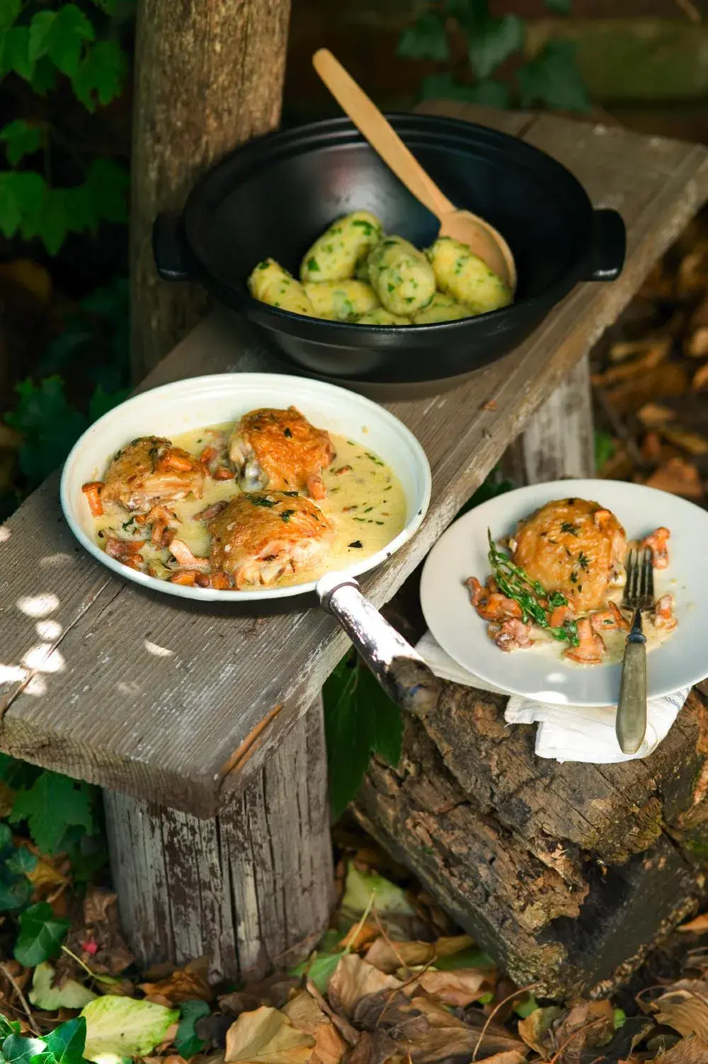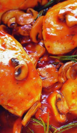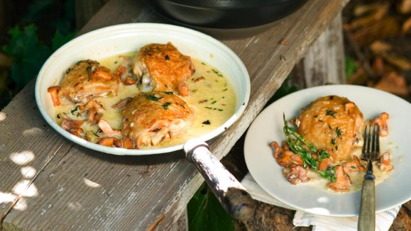 Lišky a kuřecí prsa dušená v portském víně provoní tymián, cibule a česnek.