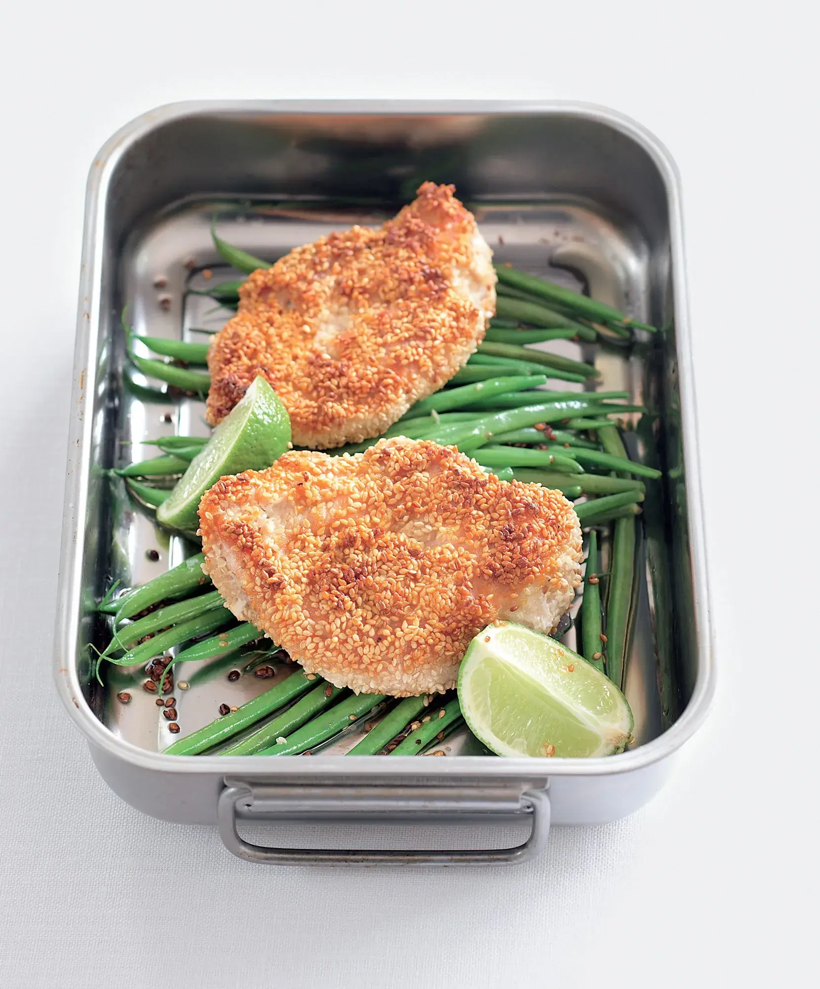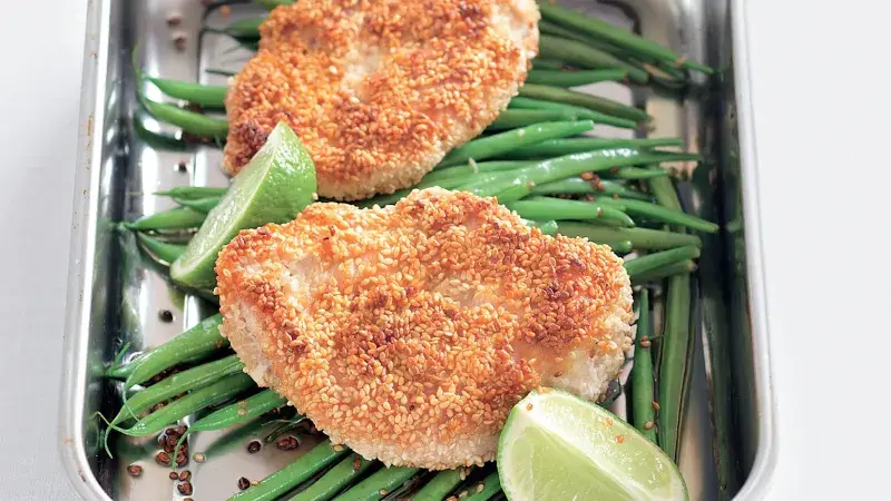 Díky sezamu budou kuřecí prsíčka pěkně křupavá, fazolky přivedou výsledný dojem k dokonalosti!