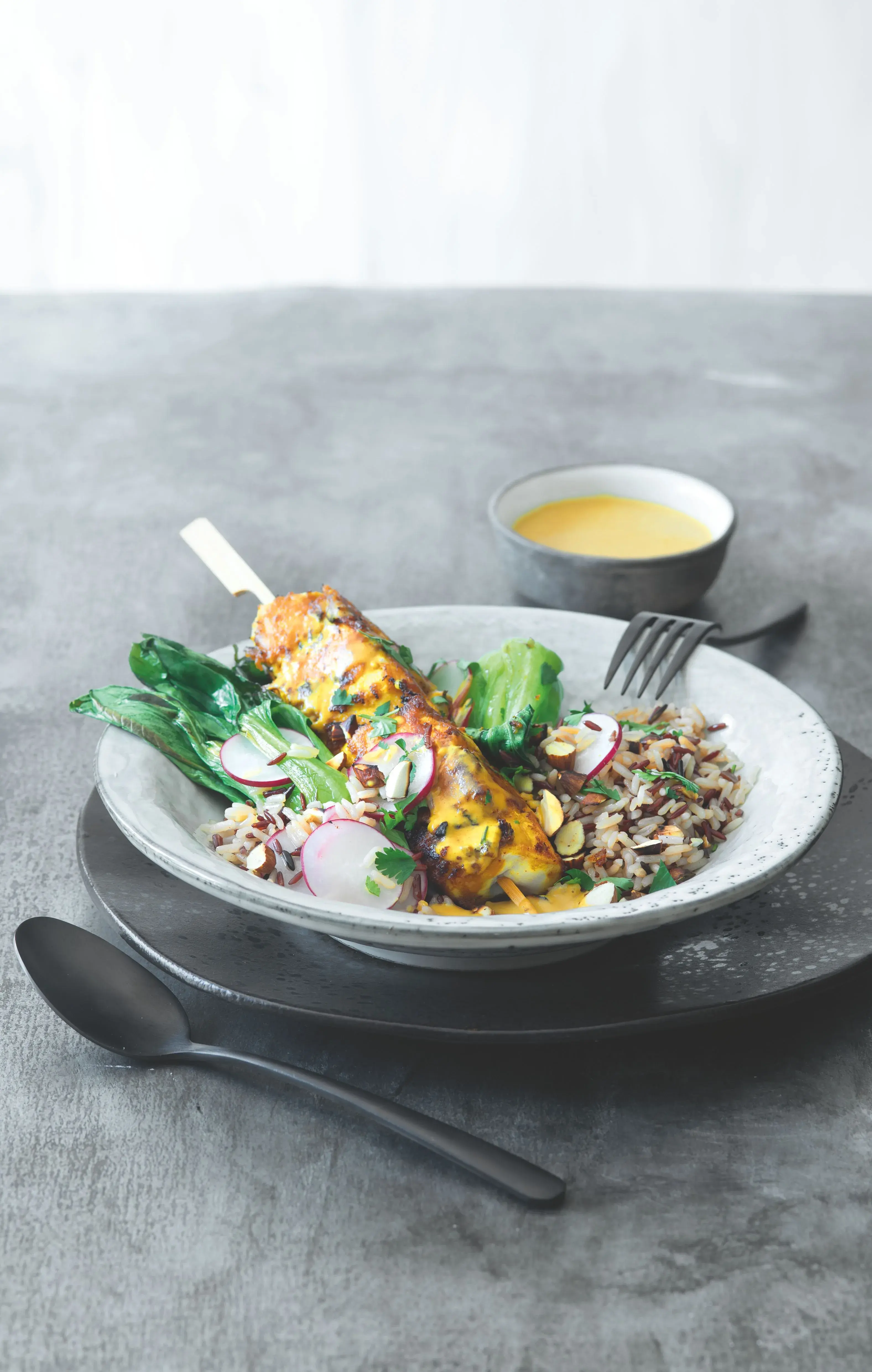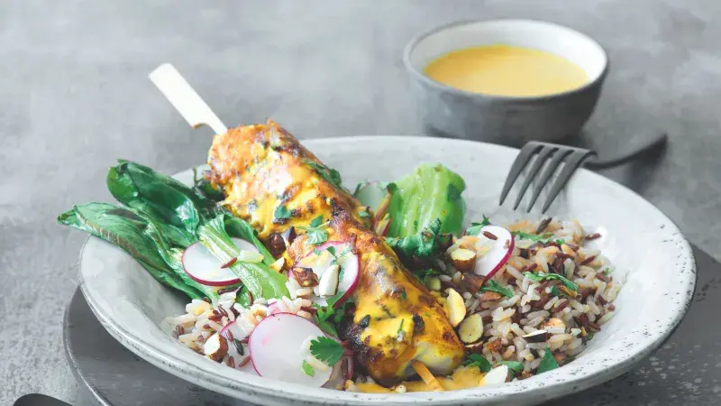 Cokoli na špejli sklidí vždycky úspěch! Tentokrát jsme klasickou omáčku satay udělali z mandlového másla a výsledek předčil naše očekávání.
