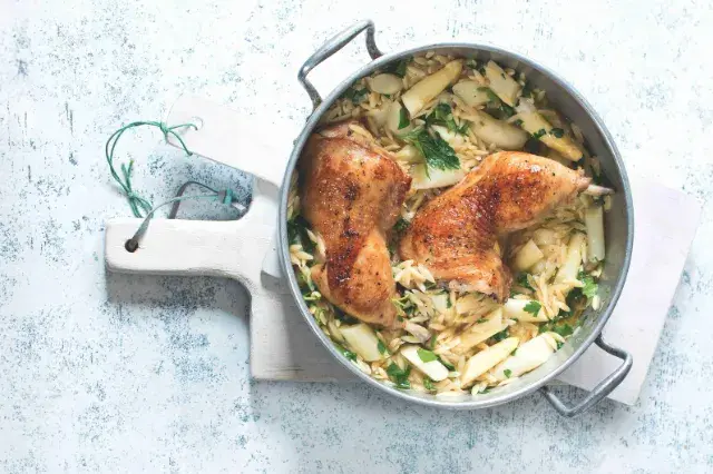 Jídla z jednoho hrnce u nás vyhrávají na celé čáře. Když po skvělé večeři nemusíte umývat horu špinavého nádobí, má to zkrátka něco do sebe. Kuřecí stehna s orzem a bílým chřestem splňují obě části zadání na výbornou.