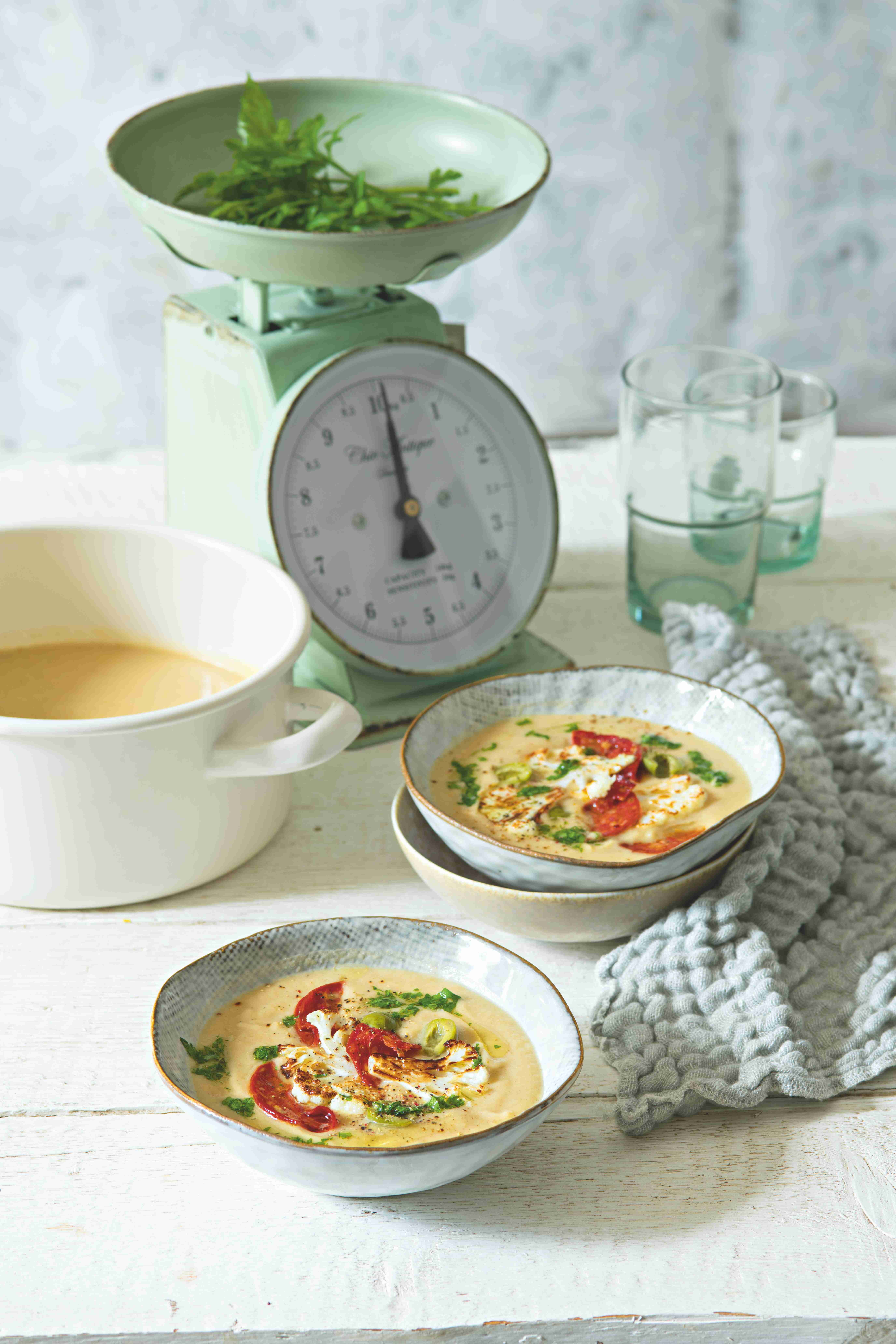 Olivy a chorizo dají jemnému květákovému krému úplně jiný švih. Pokud byste chtěli polévku připravit v bezmasé verzi, vynechte chorizo a sypejte strouhaným sýrem manchego nebo pecorino.