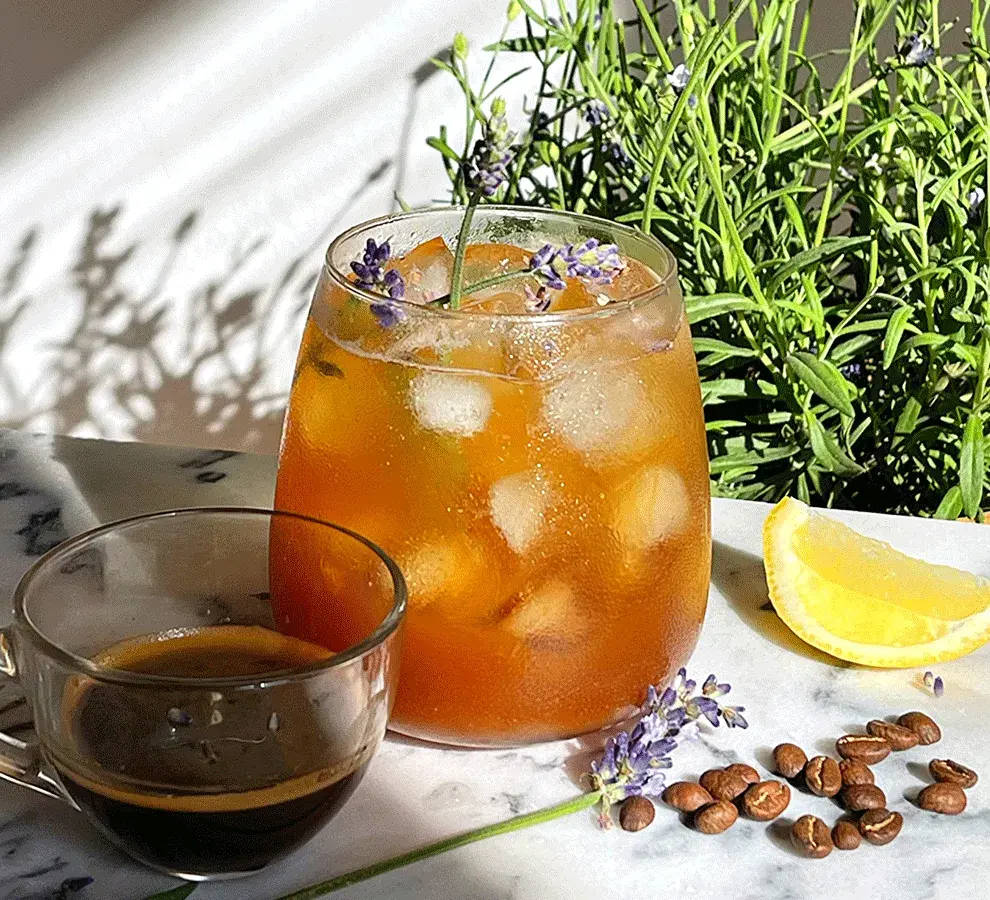 Vylepšete své espresso tonic levandulí. Stane se tak trendy letním ledovým kávovým nápojem. Vyrobte si vlastní levandulový sirup nebo ho vyměňte za bezový květ.