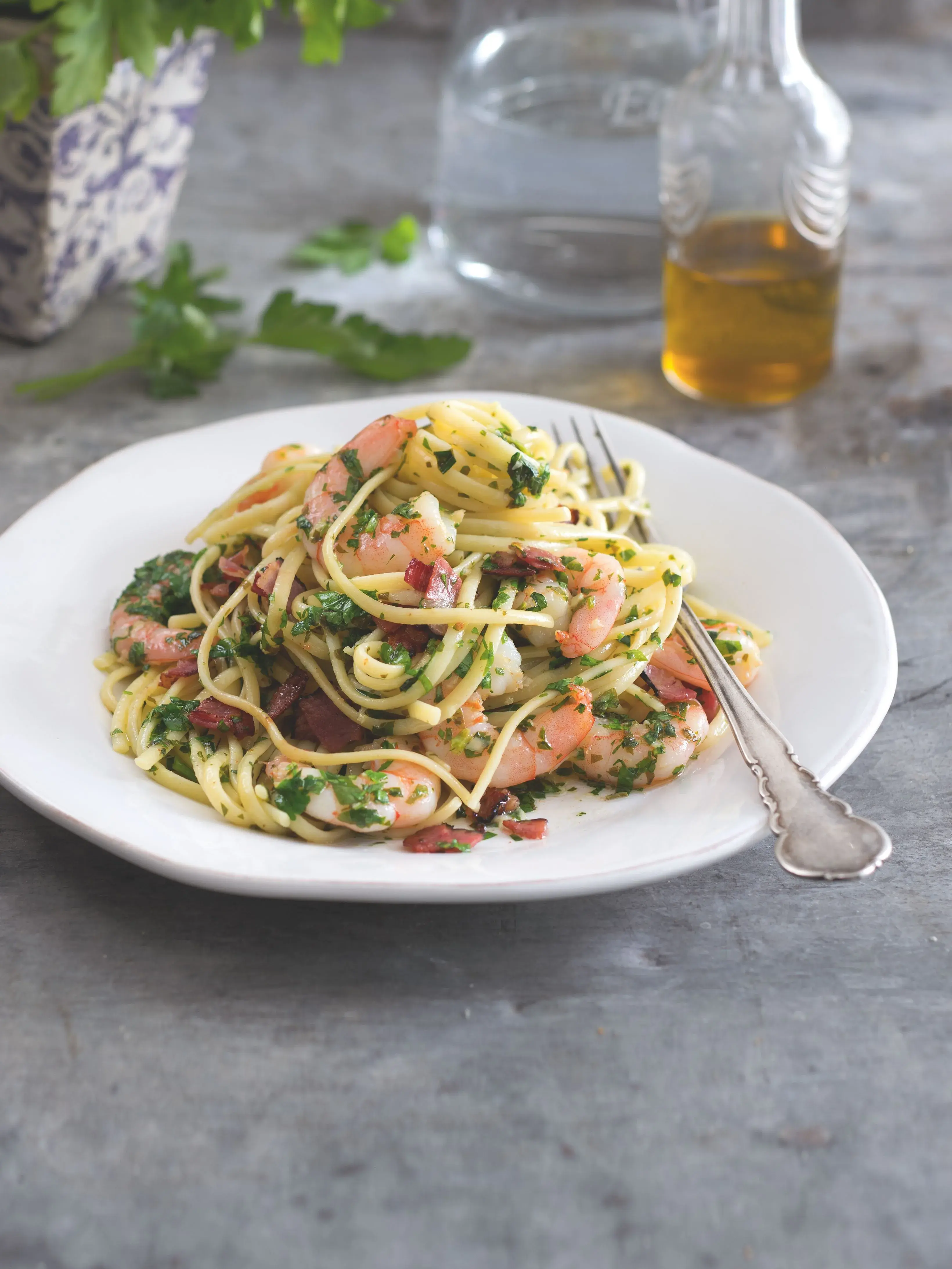 Jestli chcete svou drahou polovičku okouzlit romantickou večeří, pak linguine s krevetami a česnekovým máslem jsou ten pravý recept. Jemné krevety a výrazná slanina tvoří dokonalý chuťový akord, který rozzáří česnekové máslo s petrželkou. Načněte si lahev vína a příjemný večer ve dvou může začít.