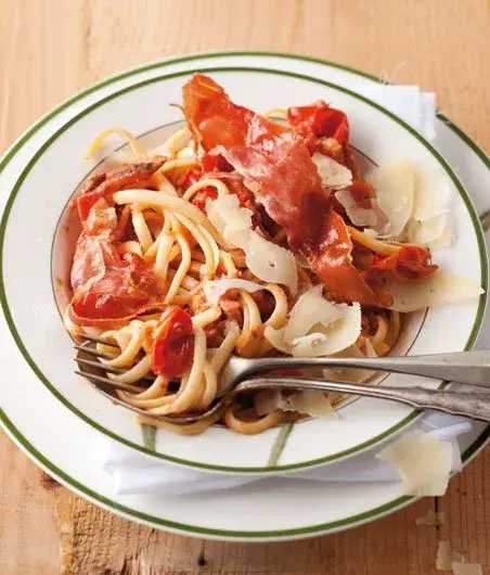 Výrazná chuť sušené šunky těmto těstovinám sluší. Najdete ji v omáčce i zavěrečné ozdobě.