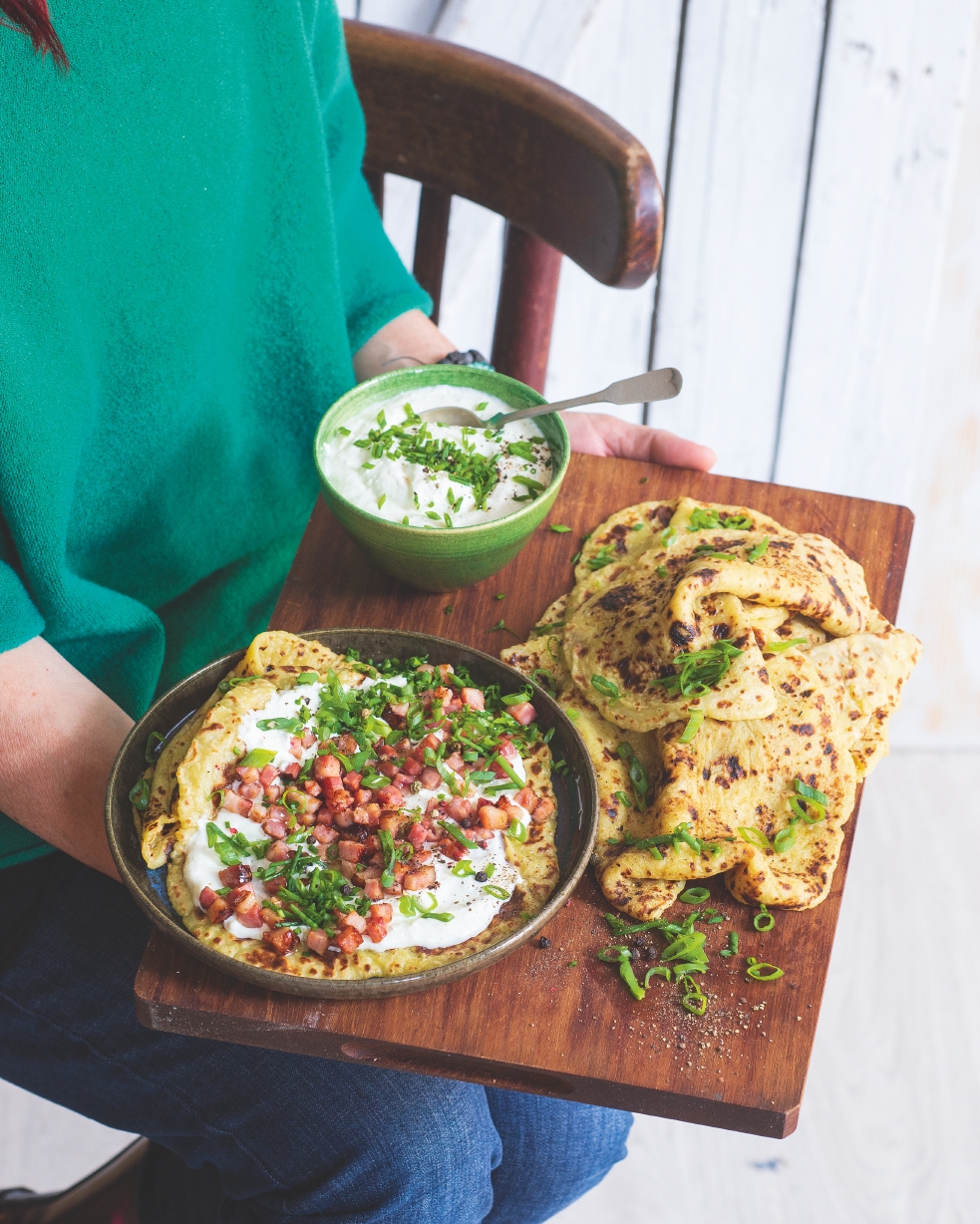 Bramborové placky oblíbené v kuchyni západního Slovenska a jižní Moravy jsme tentokrát osvěžili jarními ingrediencemi, se kterými se skvěle doplňují. Vychutnejte si jemné lokše potřené májovou brynzou smíchanou se zakysanou smatanou a posypané křupavou slaninou a jarní cibulkou.