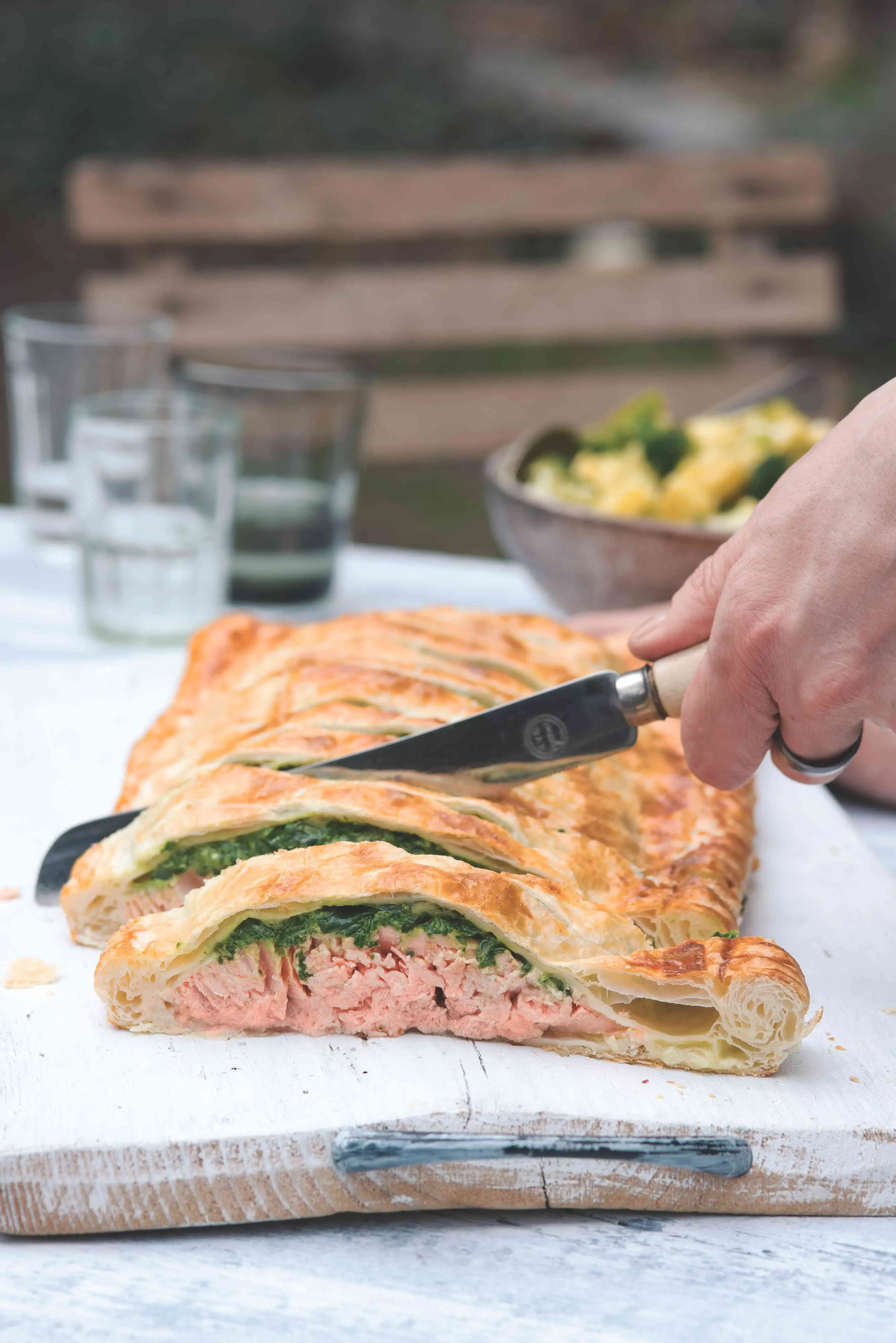 Do listového těsta můžete zabalit nejen klasicky hovězí maso, ale i pěkný kus ryby. Na rozdíl od hovězího nehrozí, že se maso uvnitř nepropeče, lososu totiž spolehlivě stačí kratší doba.