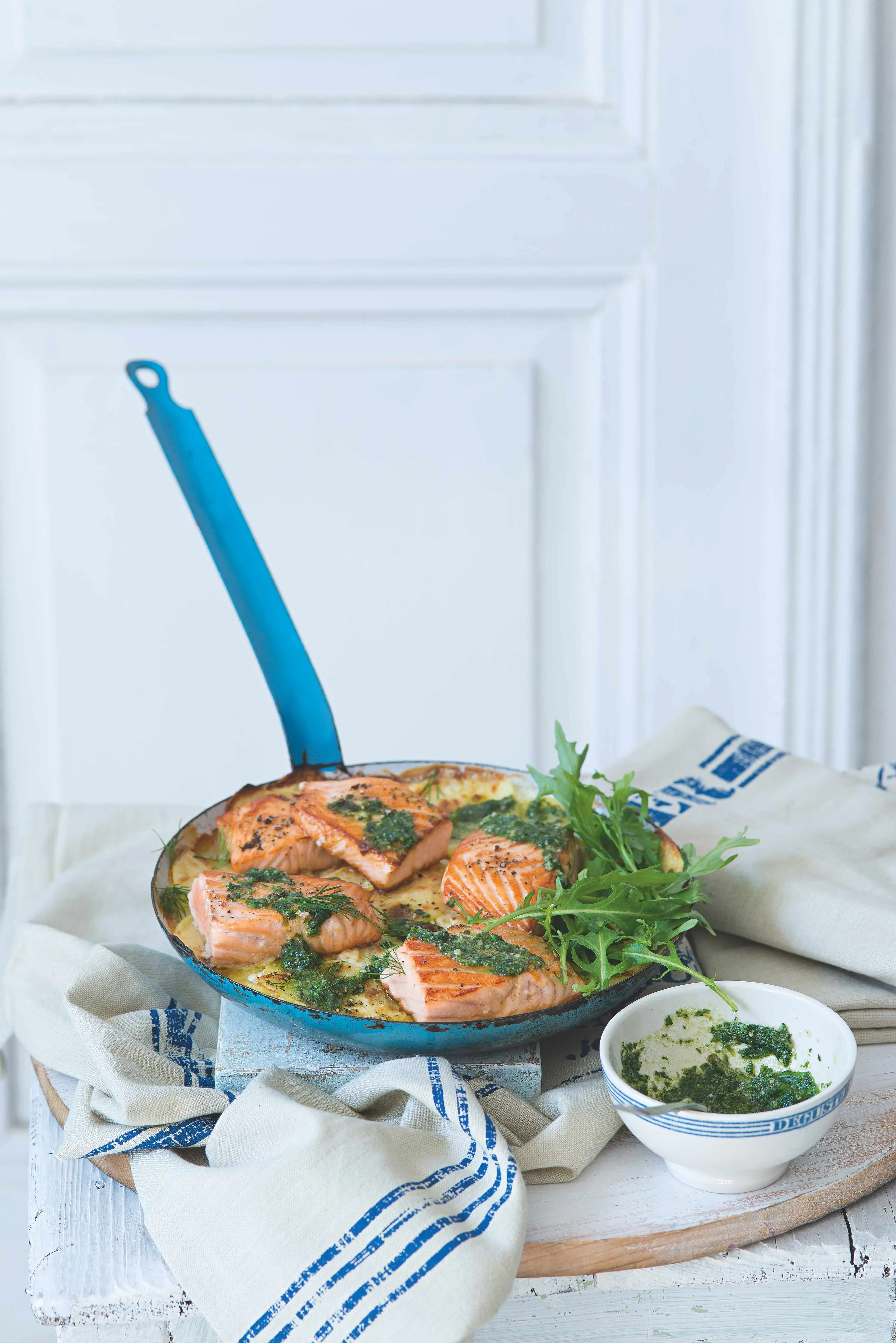 Brambory řádně osolte, jinak budou bez chuti, a do pekáčku je naskládejte v ne příliš vysoké vrstvě, aby se pěkně propekly. Rybu přidejte, až když budou brambory téměř hotové.