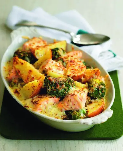 Skvělé jídlo, které uvaříte v mikrovlnce a pak už jen zapečete pod grilem. Losos zapečený s bramborami a brokolicí je perfektní večeře z jednoho pekáče, kterou zvládnete připravit i během všedních dní.