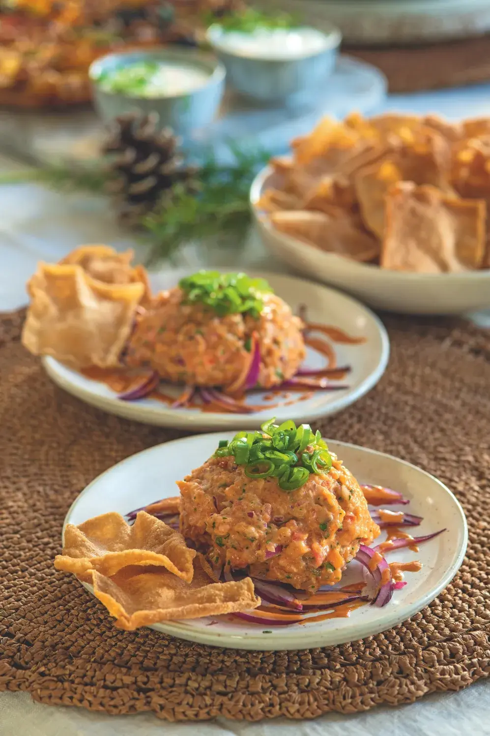 Tento lososový tatarák je spolu s křupavými chipsy z těsta na knedlíčky wonton ten nejjedlejší předkrm, který rychle mizí. P. S. Pikantní omáčka z majonézy a srirachy funguje i jako samostatný dip.