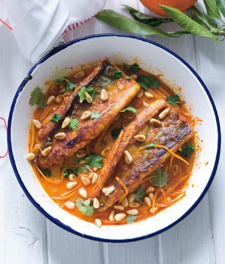 Nakonec se pomeranče skvěle hodí k rybímu masu. Chutný a dietní pokrm vám zajistí recept na pstruha vařeného v páře společně s pomerančem a tymiánem. Kdo má raději exotické chutě, tomu doporučujeme kombinaci sladkovodní ryby a exotické omáčky z harissy, pomerančové kůry, pomerančové šťávy a olivového oleje. S pomerančem si rozumí i mořské ryby jako je třeba čerstvý losos.