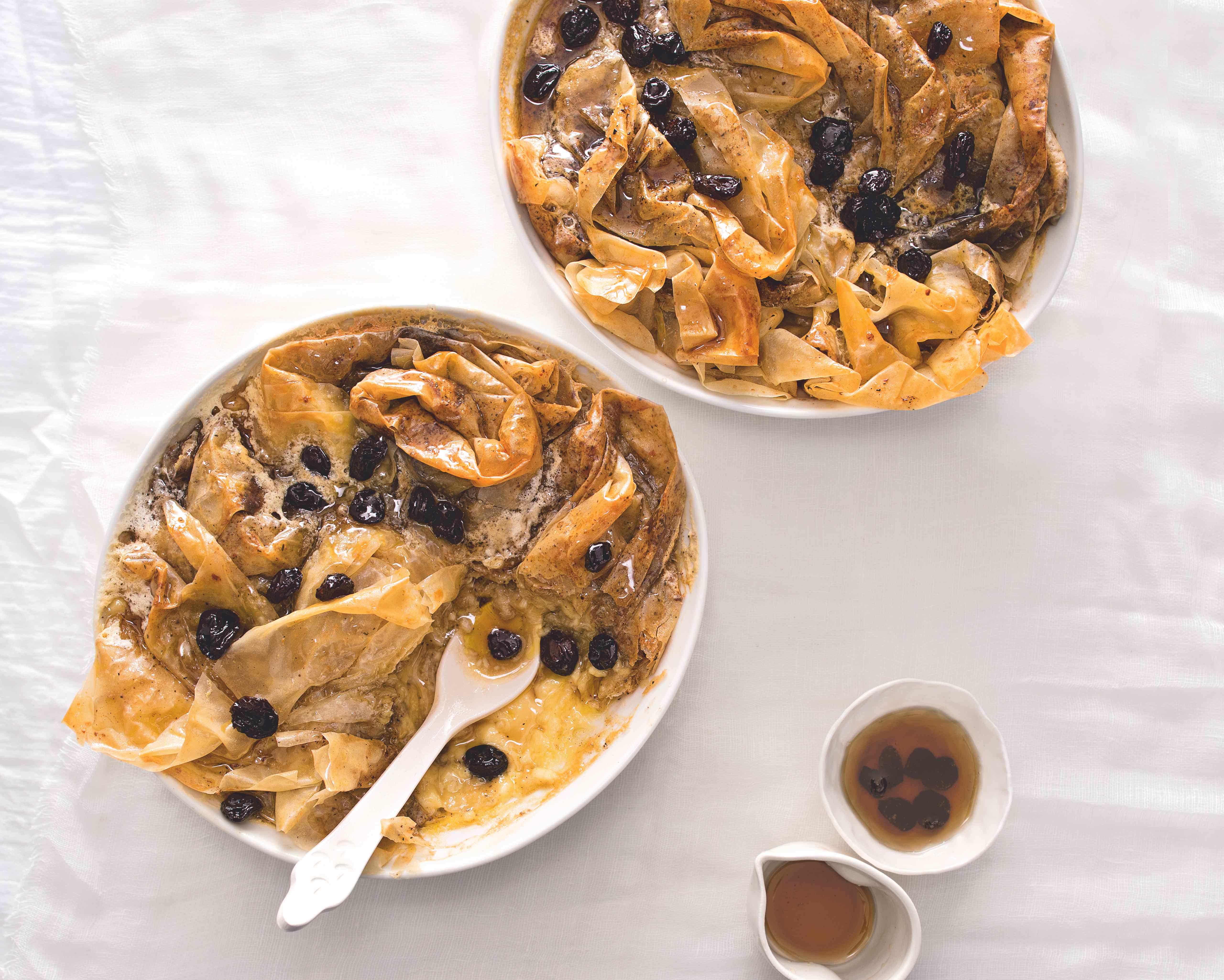 Neobvyklý dezert má pro vás hned tři příjemná překvapení – jednak strukturu, která je tvořena křupavými pláty těsta, jednak hedvábný smetanový pudink, který tvoří základ, a potom omamně dobrý voňavý sirup s rozinkami.