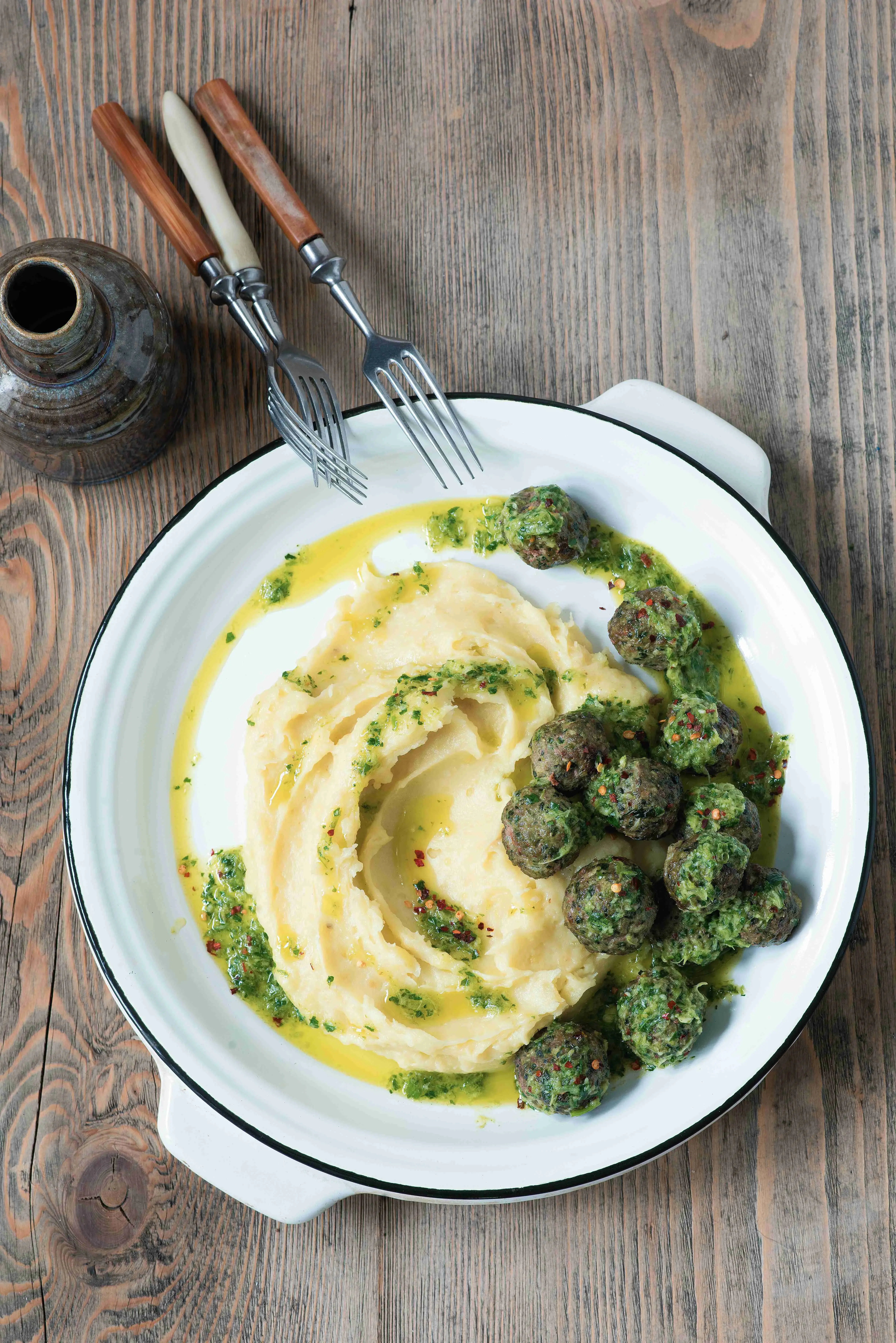 Bylinky, kam se podíváš! Přidali jsme je do samotných koulí, které jsme odlehčili mangoldem, a navíc z nich udělali skvělou salsu. Je to svěží, čerstvé, voňavé, plné chuti a neskutečně jedlé. S bramborovou kaší přesně splňují to, čemu se říká ‚comfort food‘.