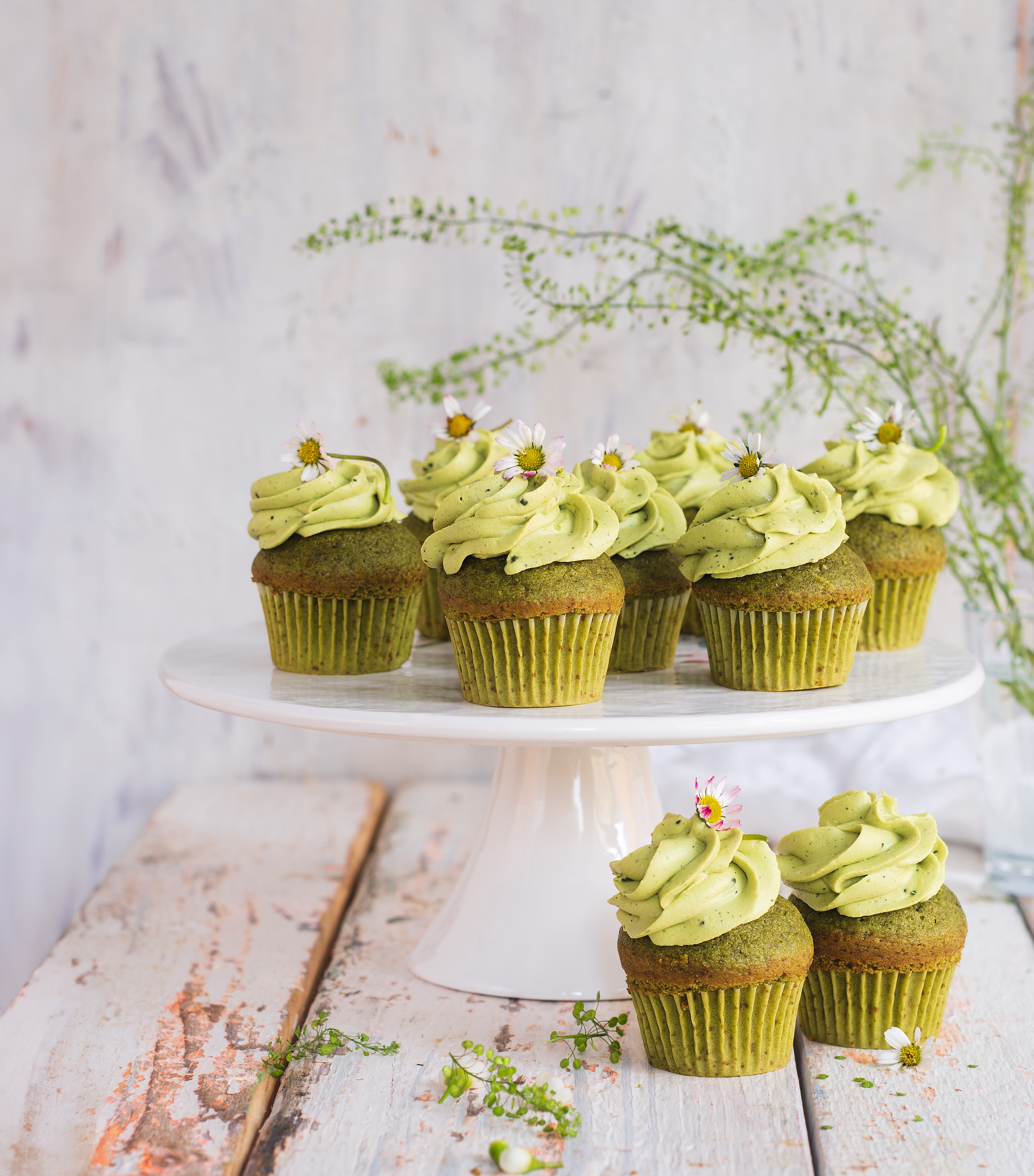Rychlé velikonoční pohoštění pro koledníky? Vsaďte na cupcaky. Roztomilé malé dortíky, které snadno ozdobíte podle dané příležitosti. Zelený matcha čaj, smetana a bílá čokoláda tvoří báječný a velmi chutný krém. Dojem umocní jedlé kvítky – v našem případě sedmikrásky, ale krásné jsou i fialky.