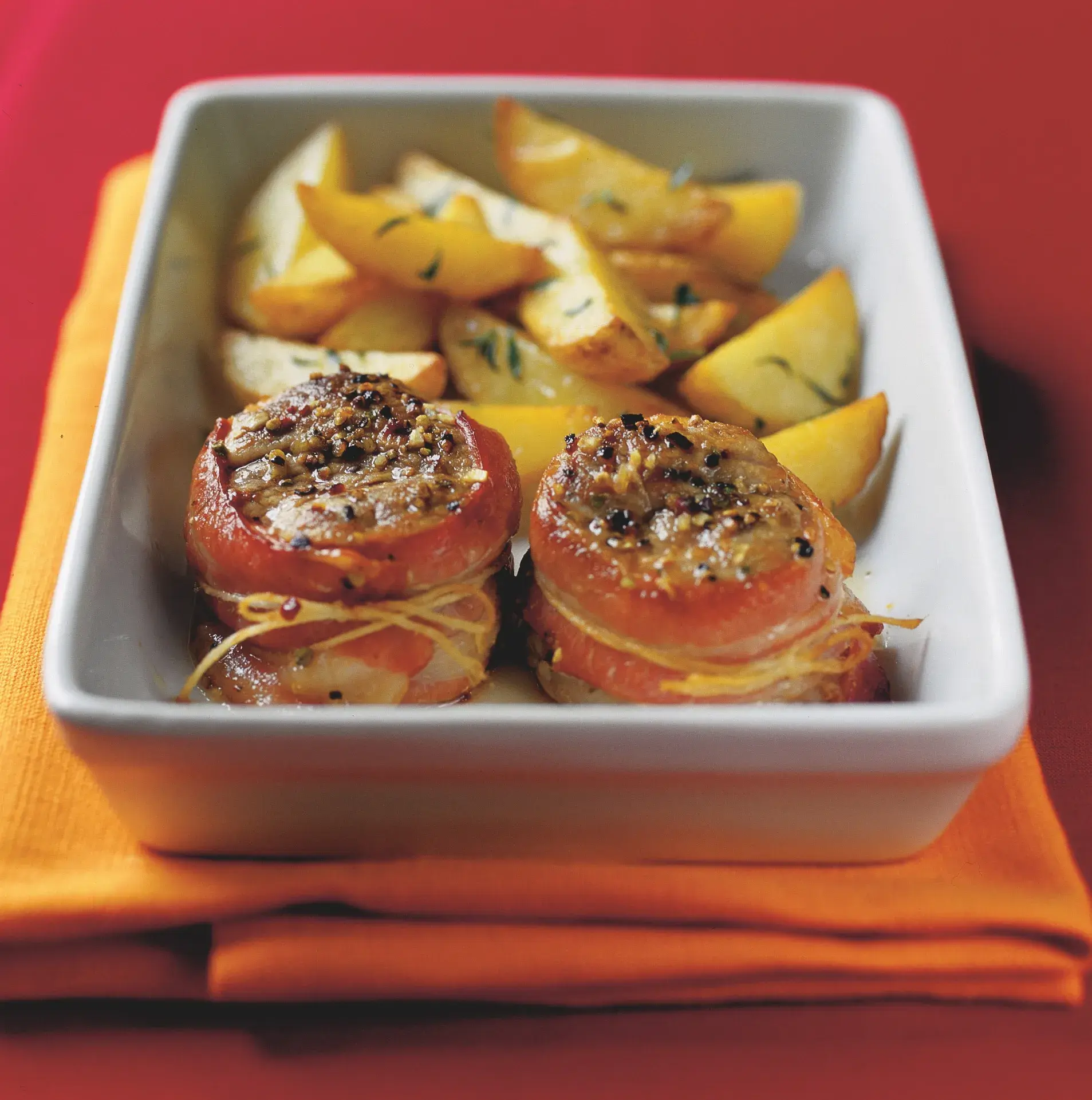 Nejjemnější kousek vepřového je mimořádně křehký a neobsahuje prakticky žádný tuk. Proto se dá upravovat jako minutka – a kabátek ze šťavnaté slaniny mu vysloveně prospěje. Medailonky z vepřové panenky s opečenými bramborami budou ozdobou vaší slavnostní tabule