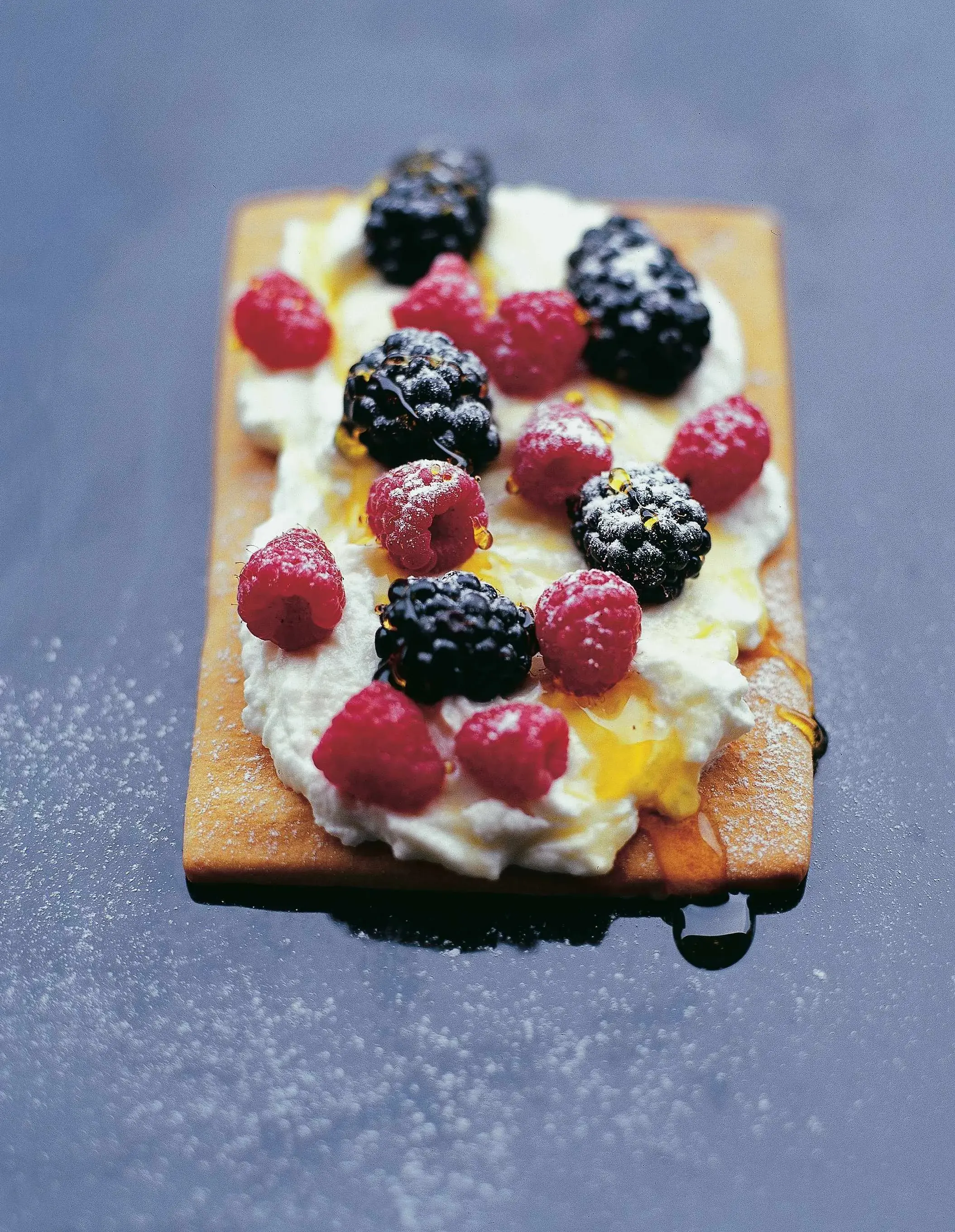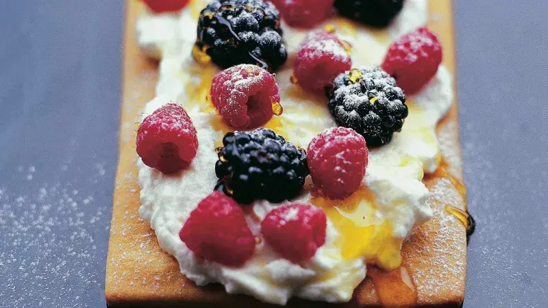 Takhle rychle a efektně by dezert nezvládl ani automat! Na základ s krémovou pokrývkou můžete naklást jakékoli drobné nebo drobně nakrájené sezonní ovoce. Pokud neseženete medovník, stejně dobře vám poslouží například dortové oplatky.