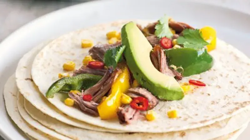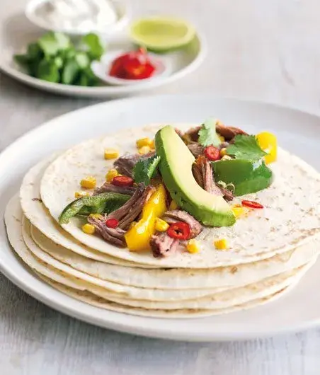 Na obložení tortill se hodí prakticky jakékoli pečené maso zbylé od svátečního stolu. Pokud žádné takové nemáte, opečte na pánvi a nakrájejte kuřecí prsní řízky, vepřovou panenku nebo třeba hovězí roštěnku.