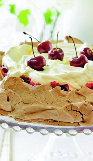 4 Bílky na krém ušlehejte v nerezové nebo skleněné míse do polotuha, pak mísu postavte na hrnec s vroucí vodou a nad vodní lázní prošlehávejte asi 10 minut. Postupně přidávejte cukr, dokud sníh nebude zcela pevný. Nakonec zašlehejte škrob. Krém natřete na korpus a ozdobte ovocem.