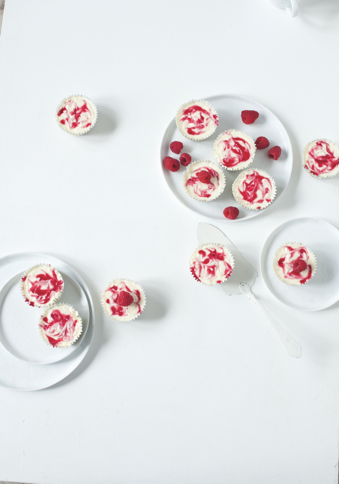 Nepečený cheesecake z bílé čokolády zdobí efektní malinové žíhání. Recept na minicheesecaky je jednoduchý, zvládne je tedy i začátečník. Navíc je bez pečení, takže nemusíte zapínat troubu. Minicheesecaky mají hned několik výhod – rychleji se vychladí a ztuhnou a padnou akorát do ruky, odpadá tak krájení, které s sebou vždy nese riziko, že řez nebude hladký a elegantní. V případě malých dortíků každý dostane svou dokonalou porci.