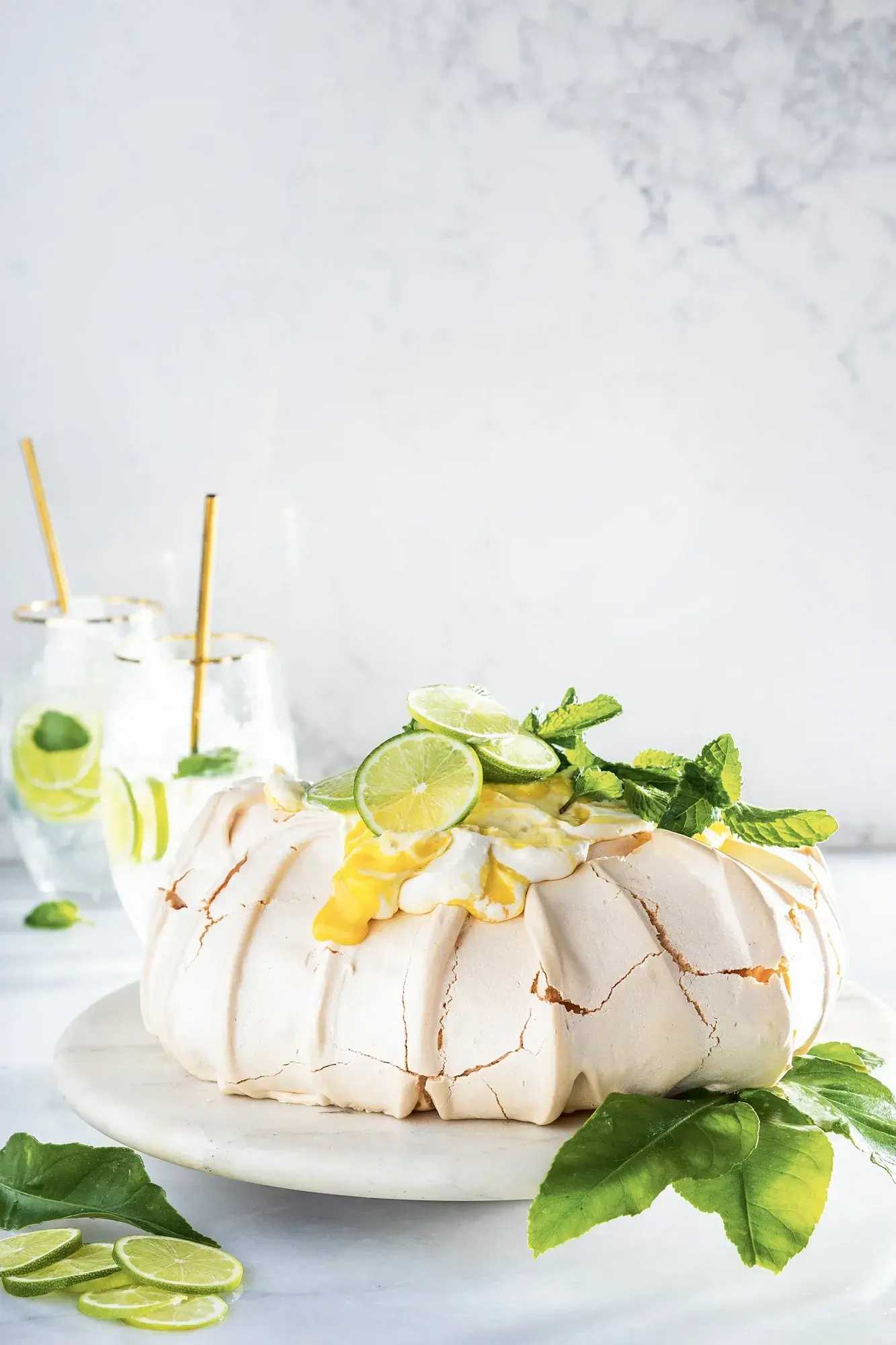 Jednoduchý dort Pavlova nabízí tolik možností, jak z něj vykouzlit báječný a v našem případě i velmi osvěžující dezert. Kombinace limetky a máty skvěle ladí v mojitu, tak proč ne i s křupavým bílkovým korpusem?
