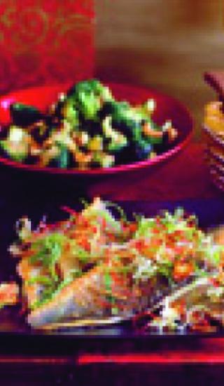 Kombinaci bazalkou vonícího rizota s křupavou rybou a vláčnou zeleninou korunuje nevšední našlehaná omáčka. Jednotlivé položky jsou časově náročnější, ale můžete si je rozfázovat a kromě ryby připravit předem. Dokončení je už velmi rychlé – a výsledek je přímo geniálně chuťově vyladěný!