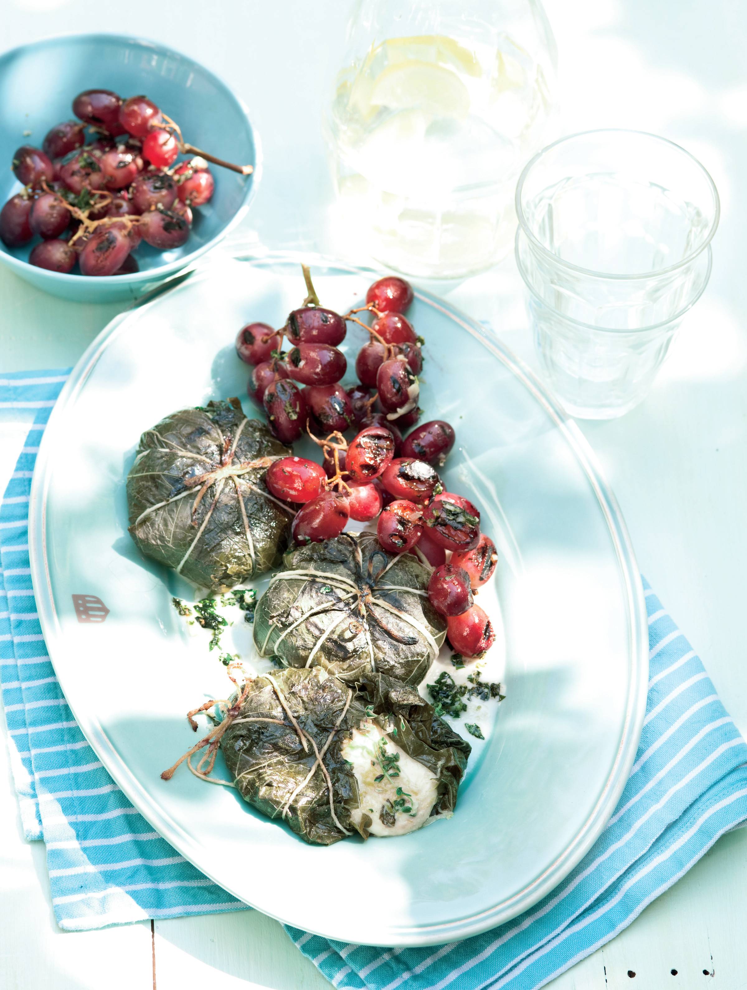 Roztékající se sýr v navinulých vinných listech a lehce zkaramelizované hrozny se stanou hitem každého grilování.