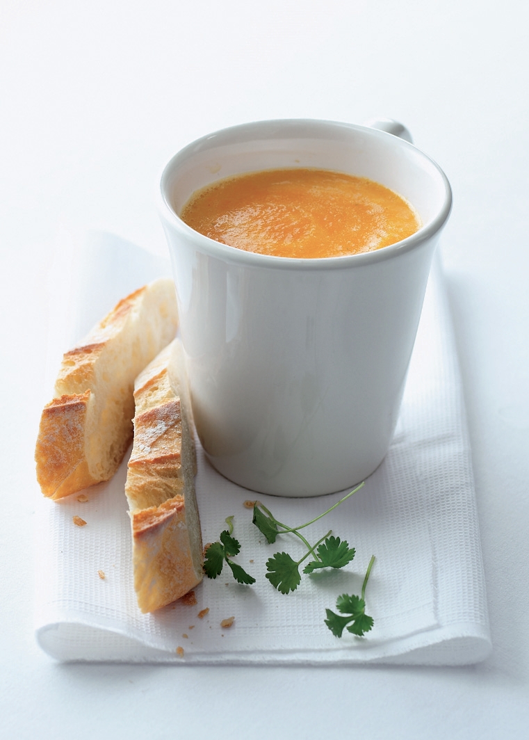Mrkev, brambora, šťáva a kůra z pomeranče a koriandr. Zajímavá kombinace chutí, rychlá příprava.