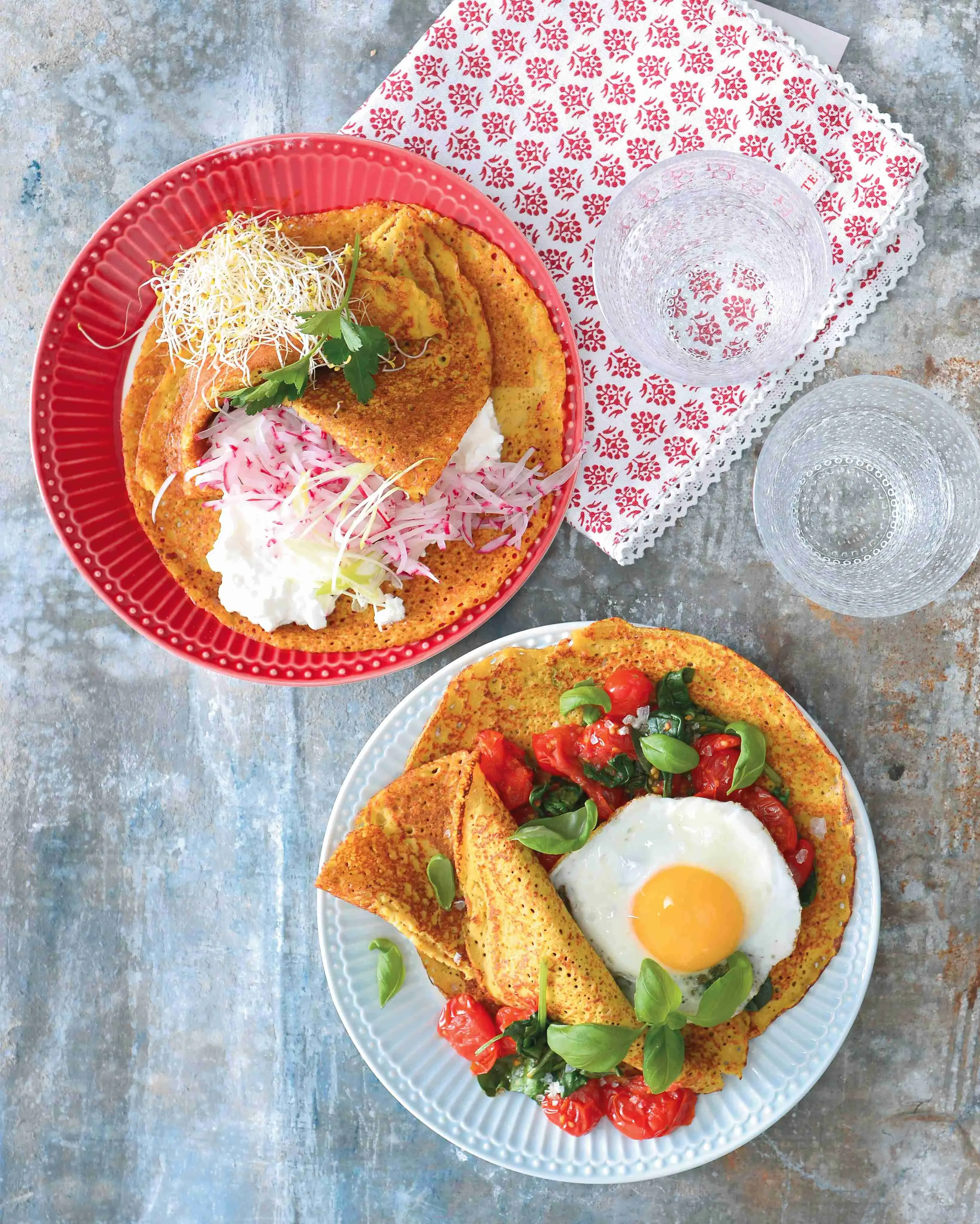 S náplní slaných palačinek si můžete vyhrát. Lehkou a svěží kombinaci ředkviček a sýra cottage, můžete zaměnit za výraznější kombinaci krémového sýra, slaniny a čedaru, k rajčatové náplni zase můžete bez obav přidat mozzarellu nebo parmazán. Pochutnáte si v každém případě.