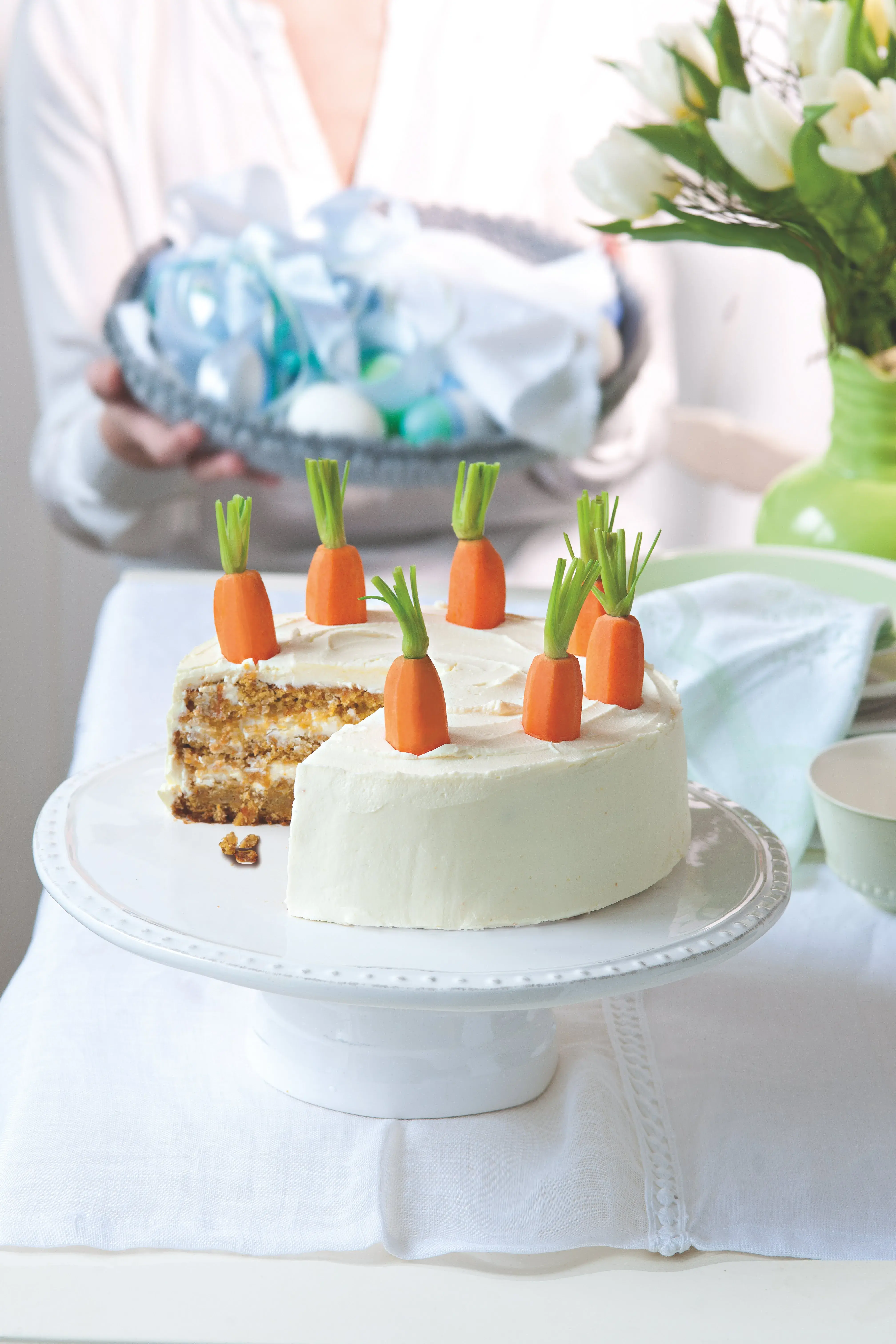 Mrkvový dort je veselý, šťavnatý a plný čerstvé mrkve. Nadýchaný korpus jsme celý potřeli krémem z mascarpone a ozdobili očištěnými mrkvičkami s natí. Ale můžete ho ozdobit podle své fantazie. Luxusní nádech mu dodají makronky nebo sněhové pusinky v kombinaci s ovocem a lístky čerstvé máty. Nejlepší je mrkvový dort až druhý den, kdy se rozleží a chutě se propojí.