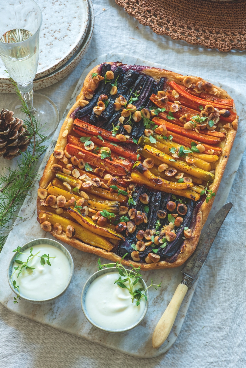 Delikátní chuť slaného koláče z listového těsta tvoří kombinace sladké mrkve, javorového sirupu a ořechů s bylinkami a slaným sýrem feta. Dokonalá chuťovka na party!