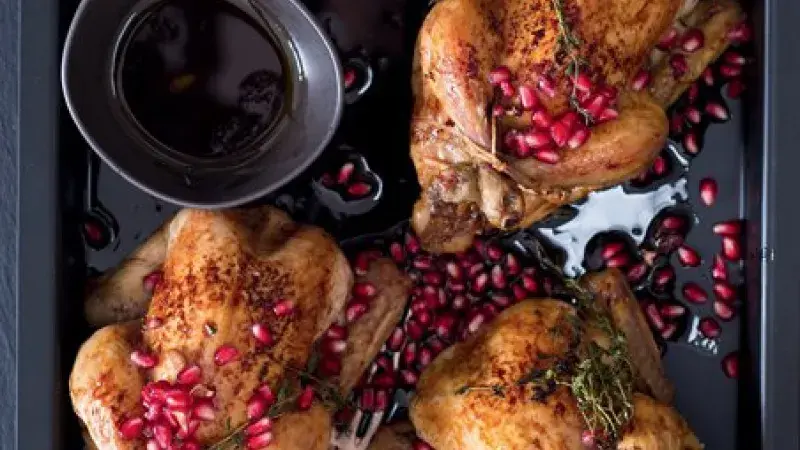 Jedno malé kuře vystačí pro jednu až dvě osoby. Na talíř ho servírujte rozpůlené, vypadá to velmi efektně, obzvlášť s nádivkou s rudými jadérky granátového jablíčka.