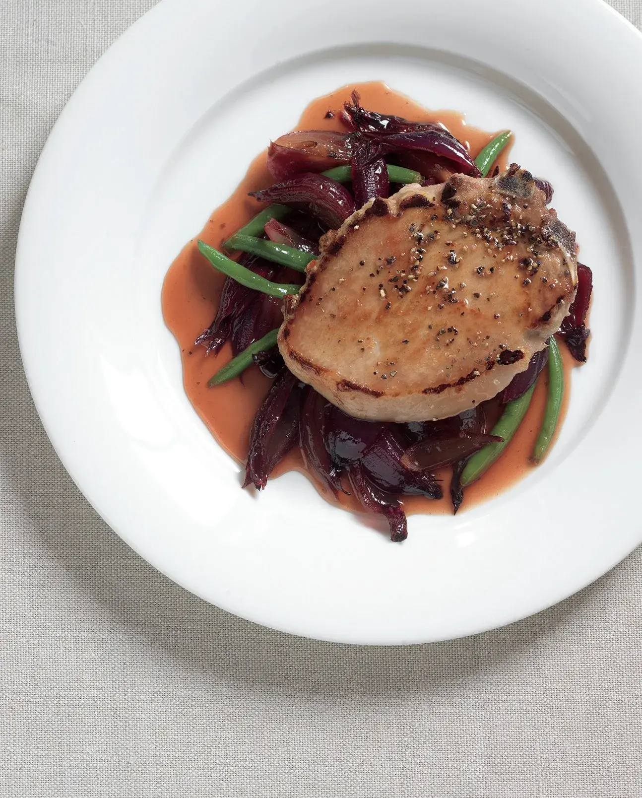Rychlé vepřové s cibulí a omáčkou vonící po jablkách.