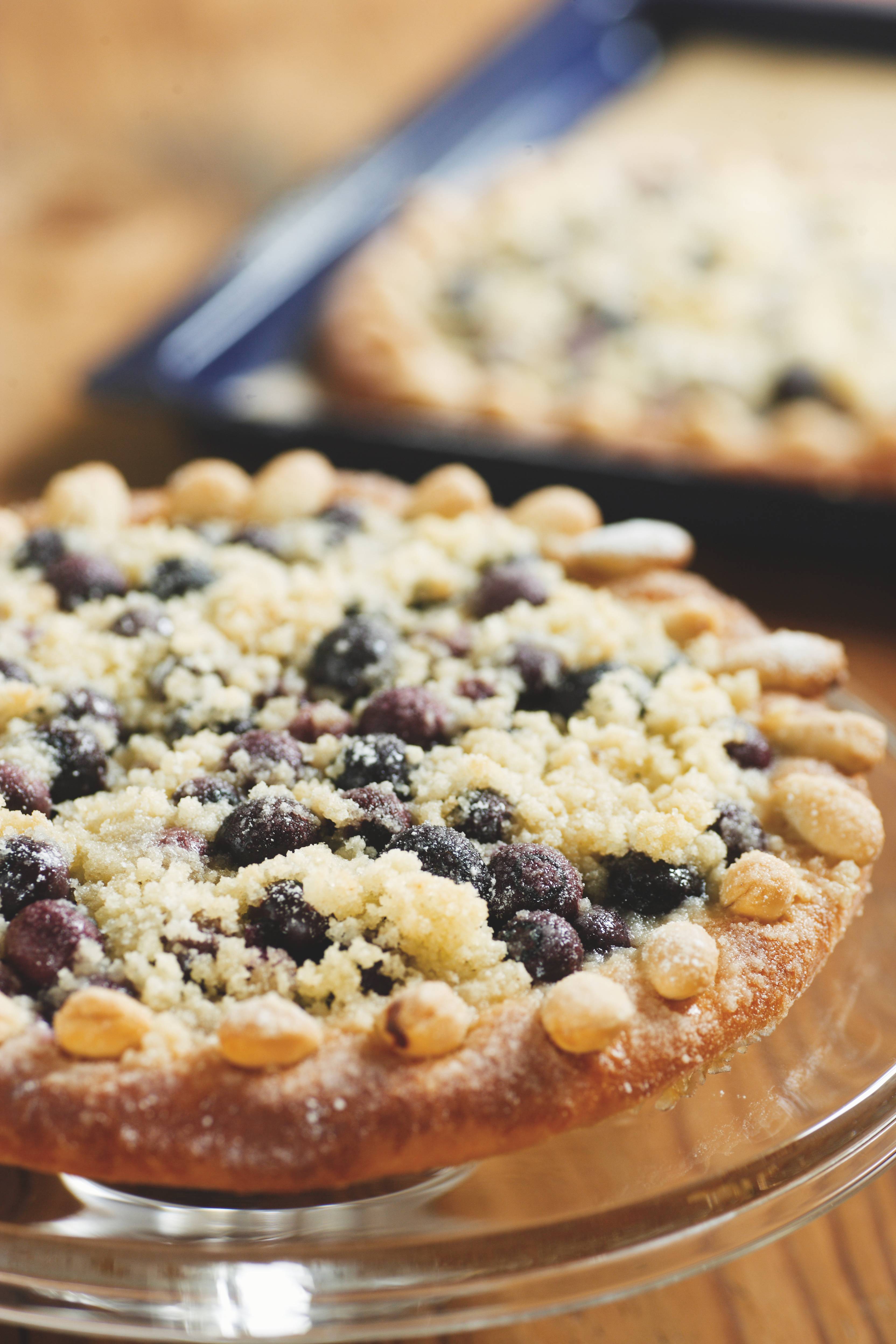- Obdélníkové koláče ‚na plech‘, nakrájené na řezy, jsou pro borůvkové verze typické. Klidně tímto způsobem vytvarujte i naše těsto.