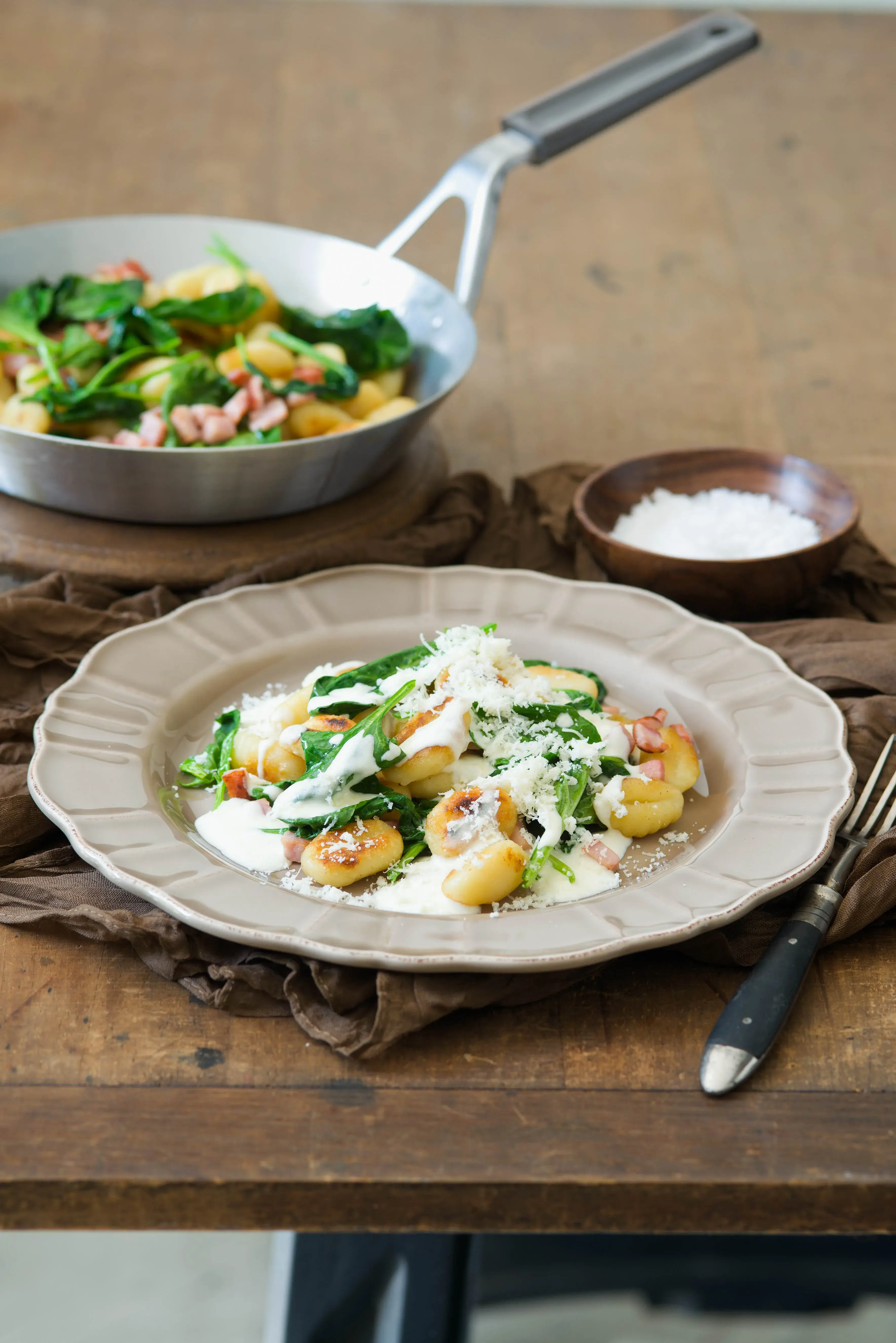 Recept na noky se šunkou, špenátem a parmazánem jsou ultrarychlé jídlo. Snadných a rychlých receptů, navíc z ingrediencí, které máte běžně doma, není nikdy dost. Další nápady na jídla, která uvaříte vcukuletu, najdete v kuchařkách Rychlé večeře a Rychlé obědy.