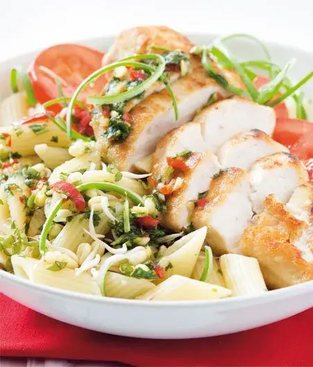 Salát můžete podávat i s pošírovaným kuřecím masem (dá se uvařit den dopředu a uchovat v lednici) nebo koupeným grilovaným kuřetem.