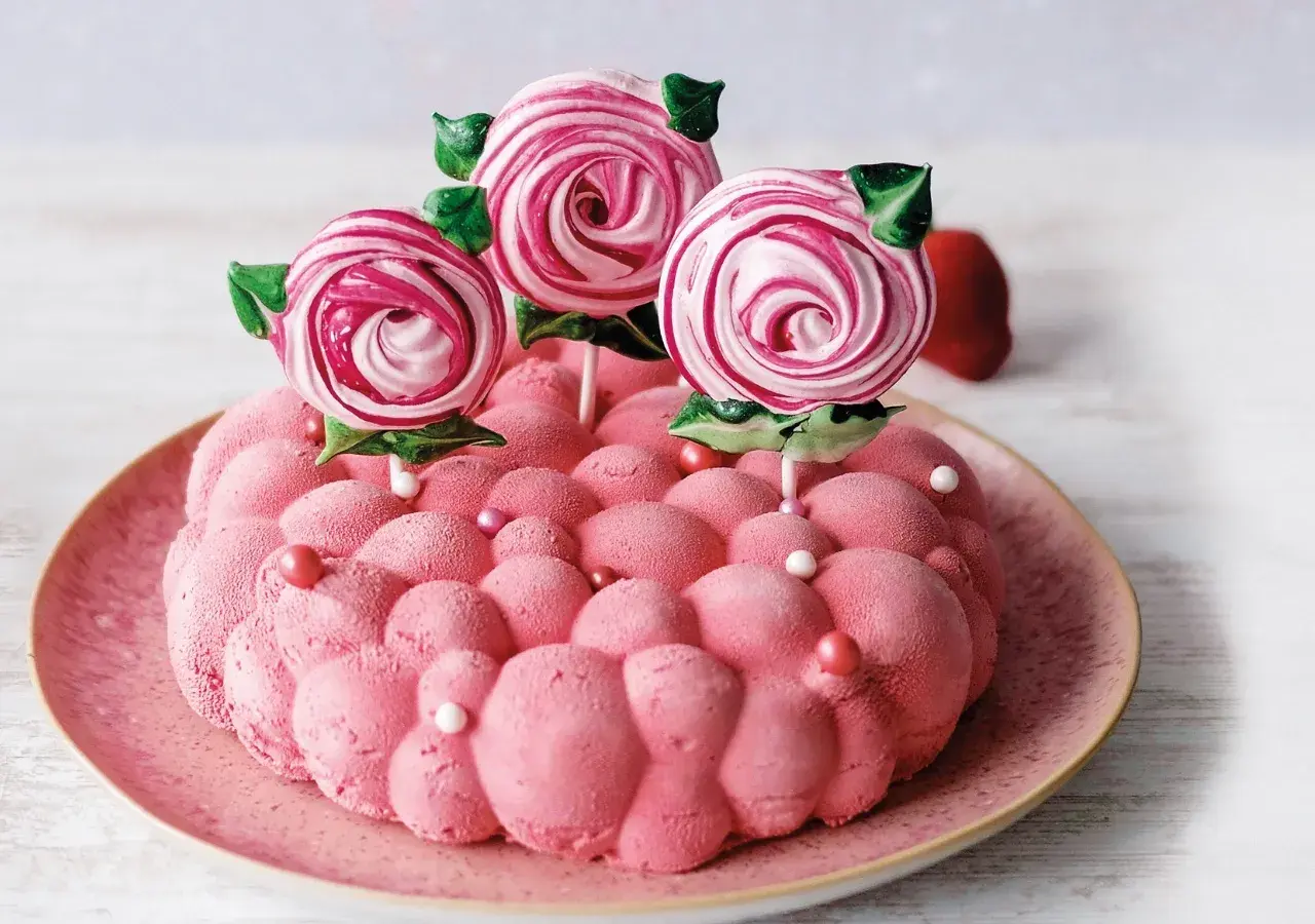 Obláčkový dort z jahodové pěny je majstrštykem pro zkušené pekaře. Věříme však, že díky podrobnému návodu ho zvládnou i cukráři začátečníci. Velvetový efekt je pověstnou třešničkou na dortu, stejně jako pusinková lízátka.
