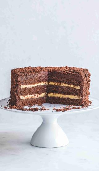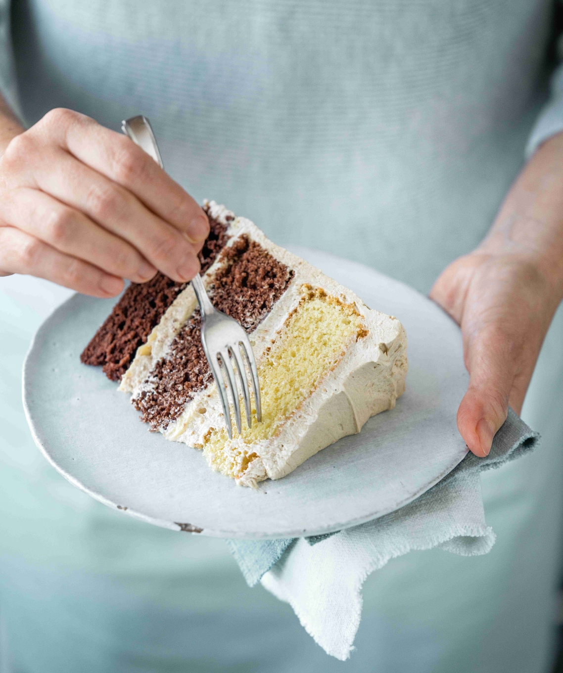 Zvenku bílý, uvnitř efektně pruhovaný. Tento dort v sobě navíc spojuje hned tři potěšení: kořeněný černý čaj, kávu a čokoládu.