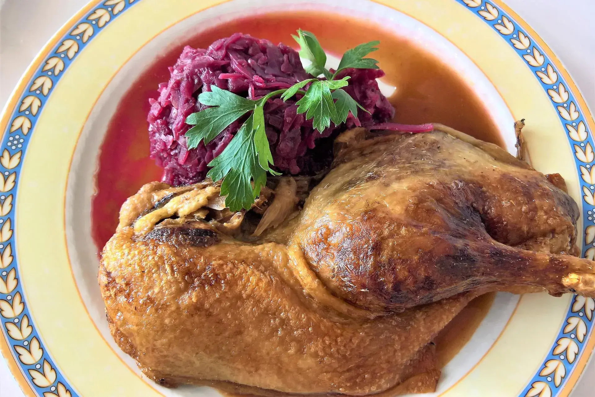 Zelný salát je velmi dobrý. Kdo nehlídá každý gram tuku, může zvolit horní část stehen – jsou sice tučnější, ale šťavnatější.