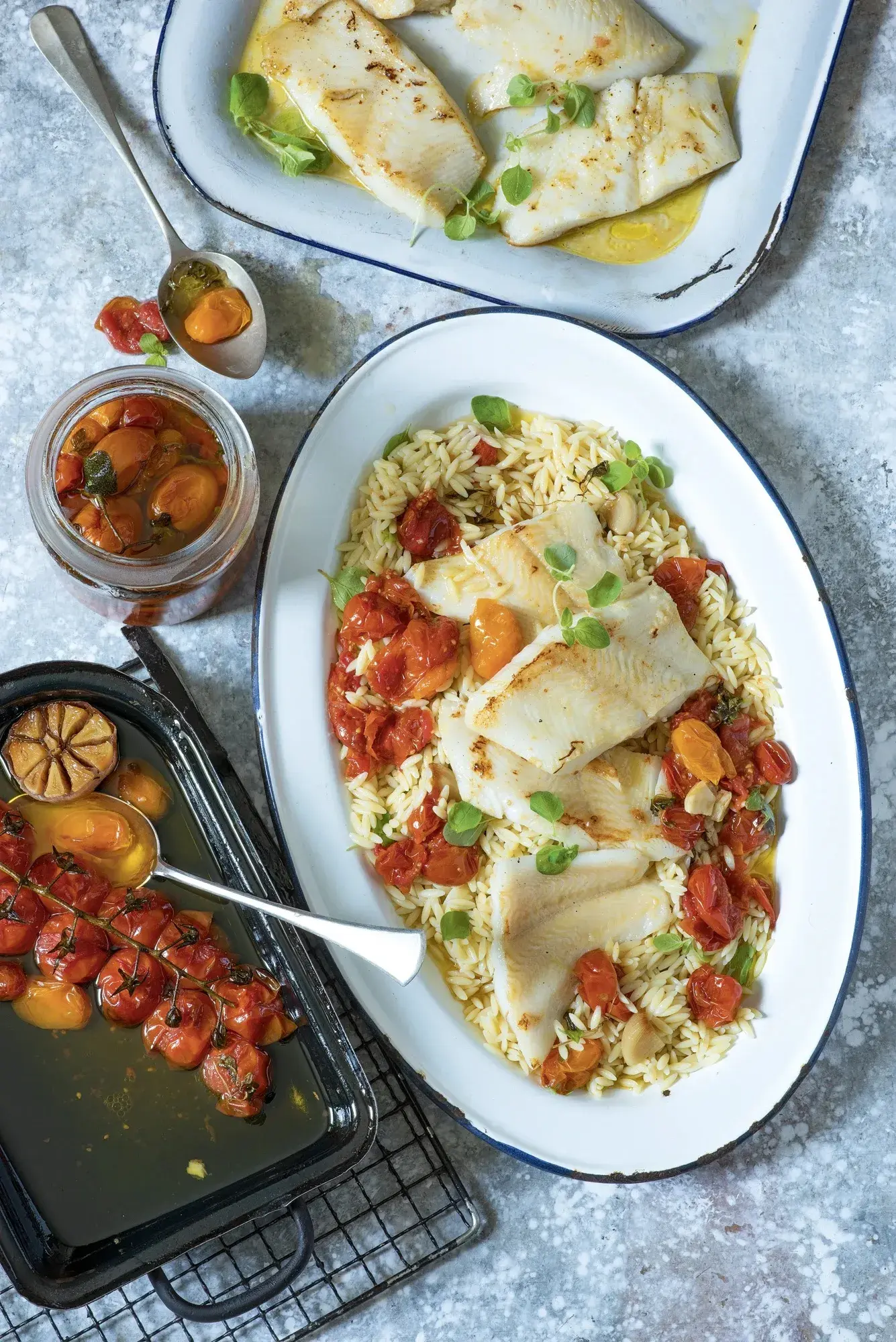 Orzo s konfitovanými rajčaty a rybou je jednoduché a nenáročné letní jídlo, které vás zasytí a zároveň vám po něm nebude těžko. Konfitovaná rajčata si můžete udělat do zásoby a uchovat je na později. Mají i mnoho dalšího využití.