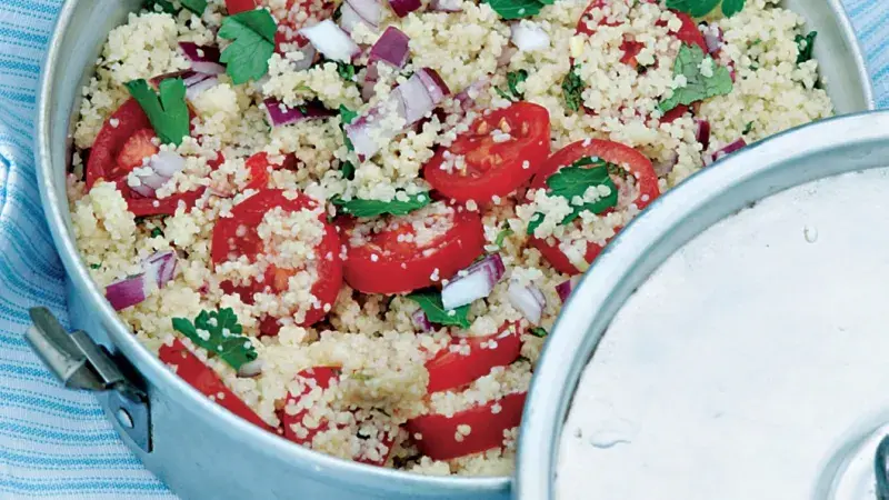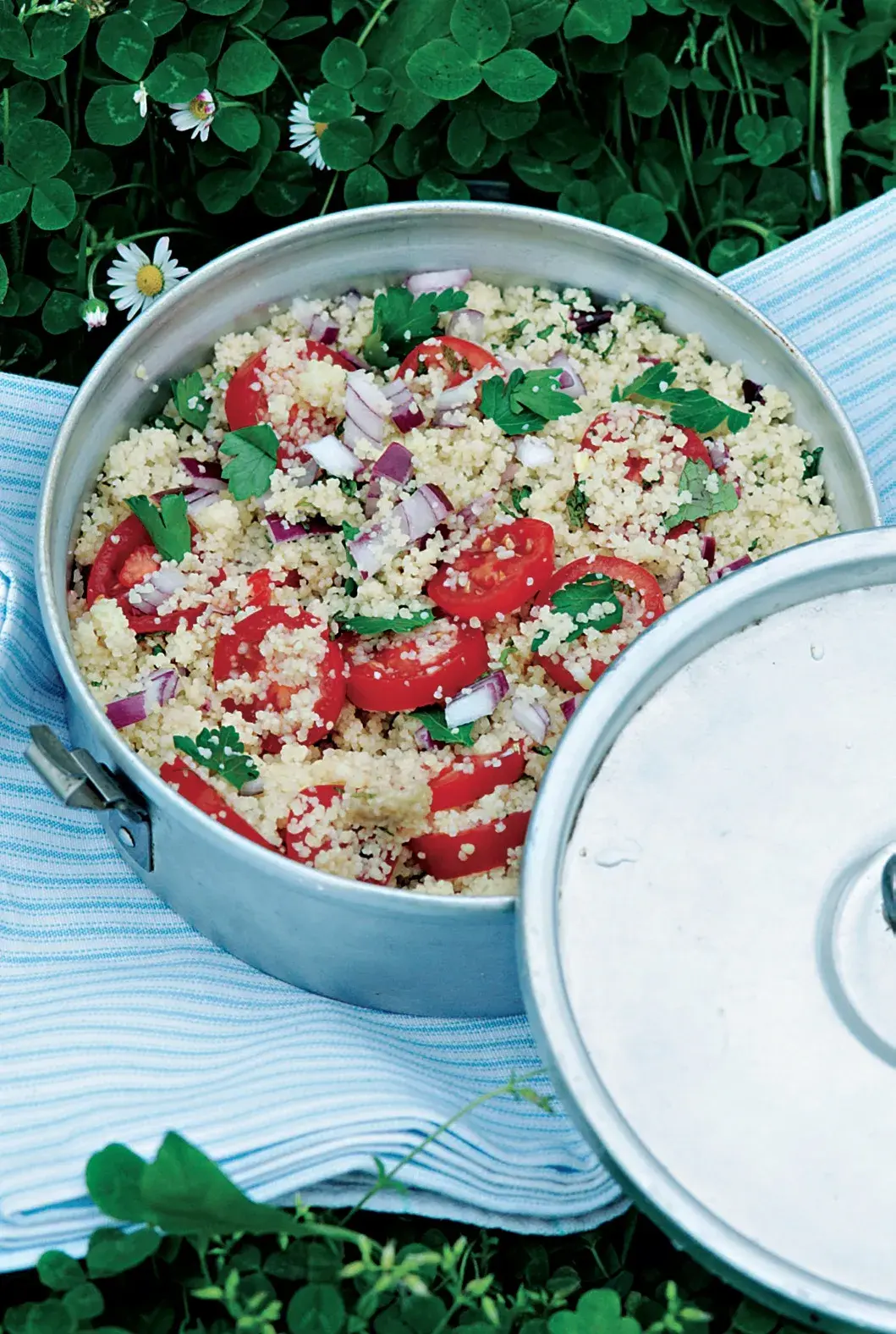 Kuskusu věnujte lásku – promíchávejte ho rukama a dejte mu čas nasát všechny chutě i vůně. Přijme je z rajčat, oleje, citronové šťávy a soli; voda do něj patří až nakonec! Tabouleh je výborný jako předkrm nebo příloha ke kuřeti či rybě.