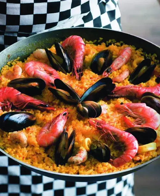 Původně prosté jídlo španělské Valencie se časem stalo symbolem celé země. Kdysi si sedláci do rýže upravené na ohni dávali zeleninu a hlemýždě, dnes v ní najdete králičí i vepřové maso, artyčoky i jelita. Nejoblíbenější ale zůstává paella marinera - s mořskými plody.