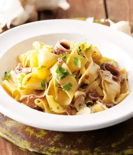 Širokým nudlím dodají sardelky výraznou a sytou chuť.