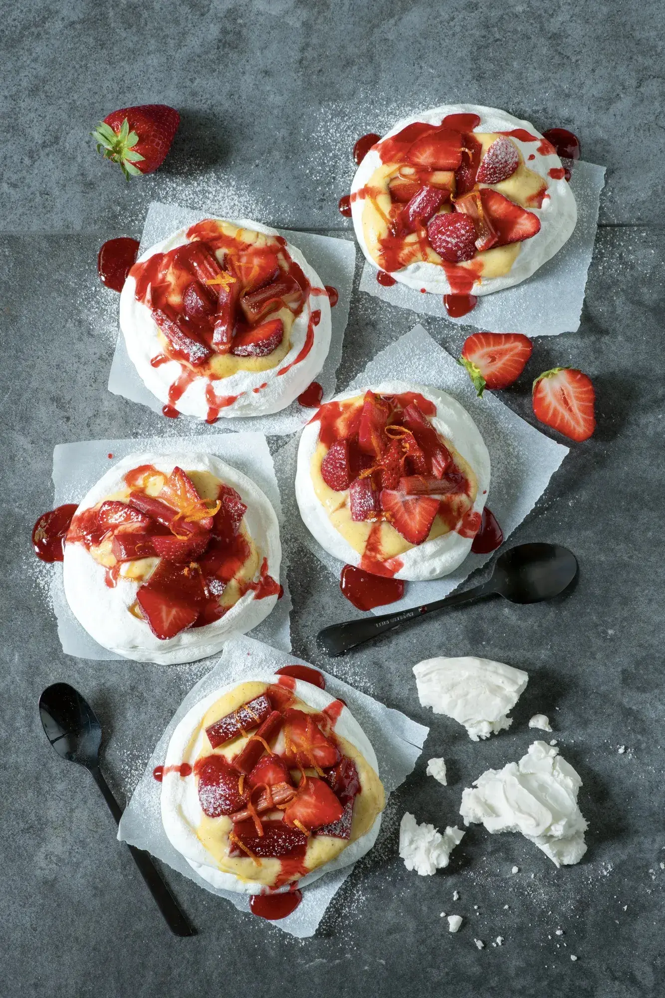Pavlovy se žloutkovým krémem, rebarborou a jahodami je osvěžující dezert nejen na první letní dny. Naprosto dokonalá kombinace sladké bílkové pusinky, vanilkového krému a nakyslého rozvaru z rebarbory. Nejen že luxusně vypadá, ale také chutná!