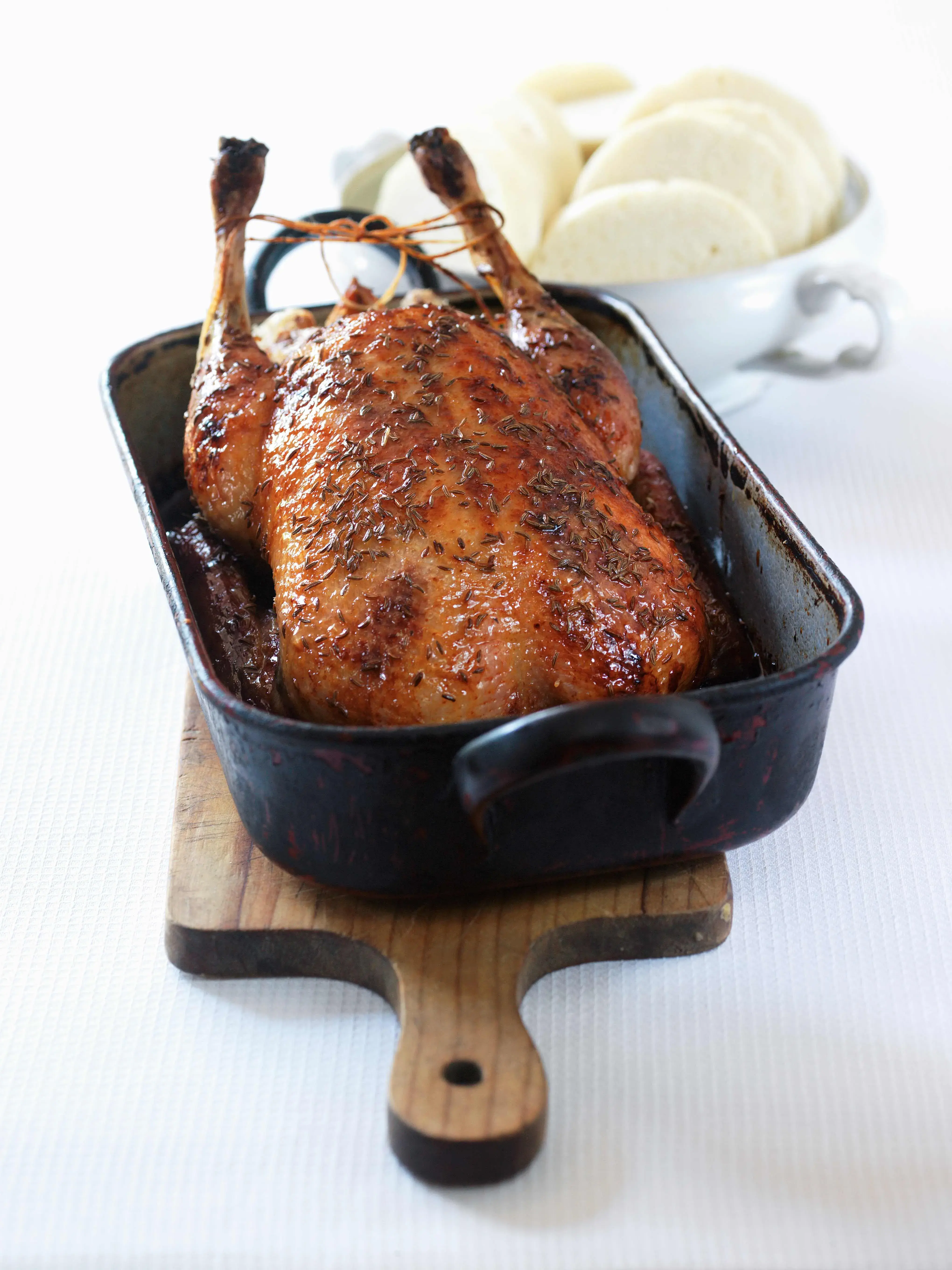 Tajemství úspěchu spočívá v pomalém pečení a odebírání kachního sádla. Pečená kachna je ideální pro vydatné pohoštění na slavnostní nedělní oběd. Aby byla dokonalá, nechte ji na závěr zezlátnout. Pokud chcete, aby bylo maso ještě šťavnatější, přidejte ke kachně jablka.